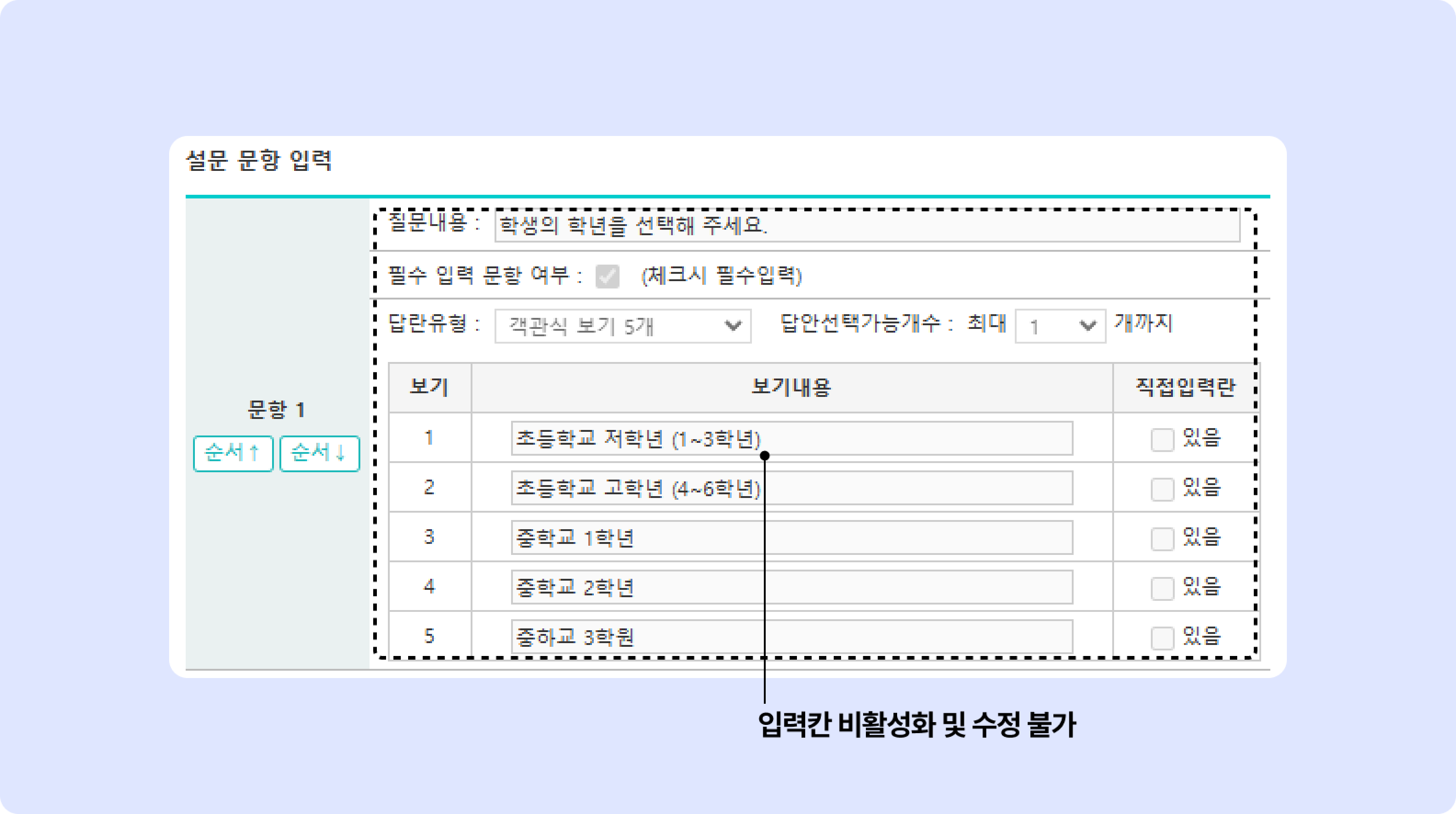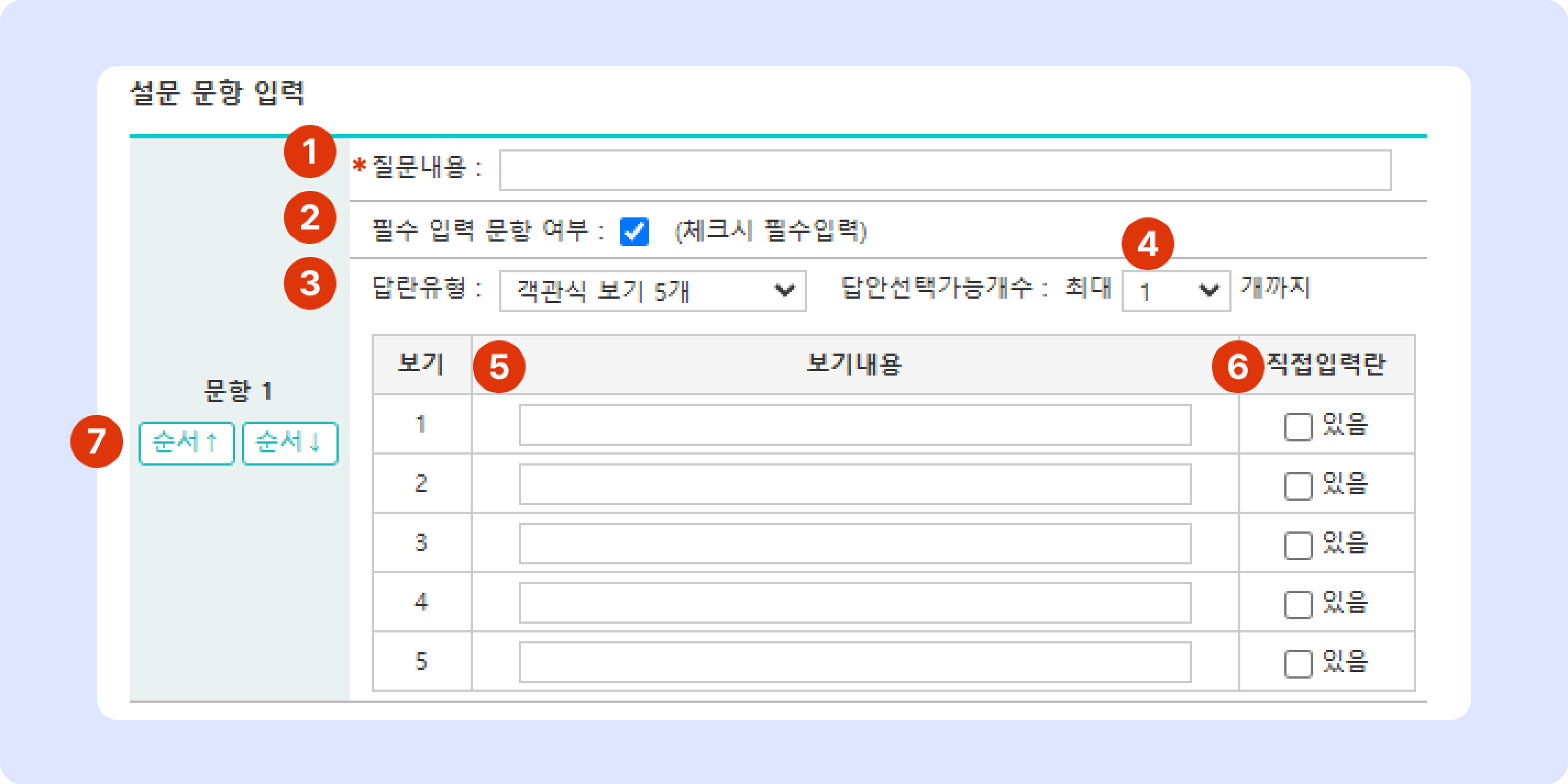 객관식 보기 2개(최소) ~ 객관식 보기 5개(최대): 개수에 따라 보기 개수가 조절됩니다. (문항 입력 4.로 이동)