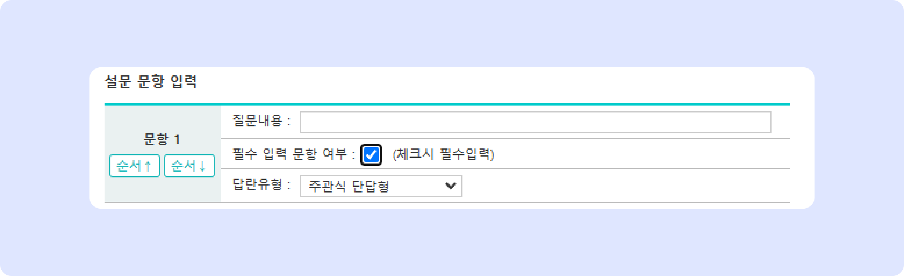 주관식 단답형/장문형 선택 시 질문의 내용만 입력하고 답변을 주관식으로 입력 받습니다. (문항 입력 완료)
