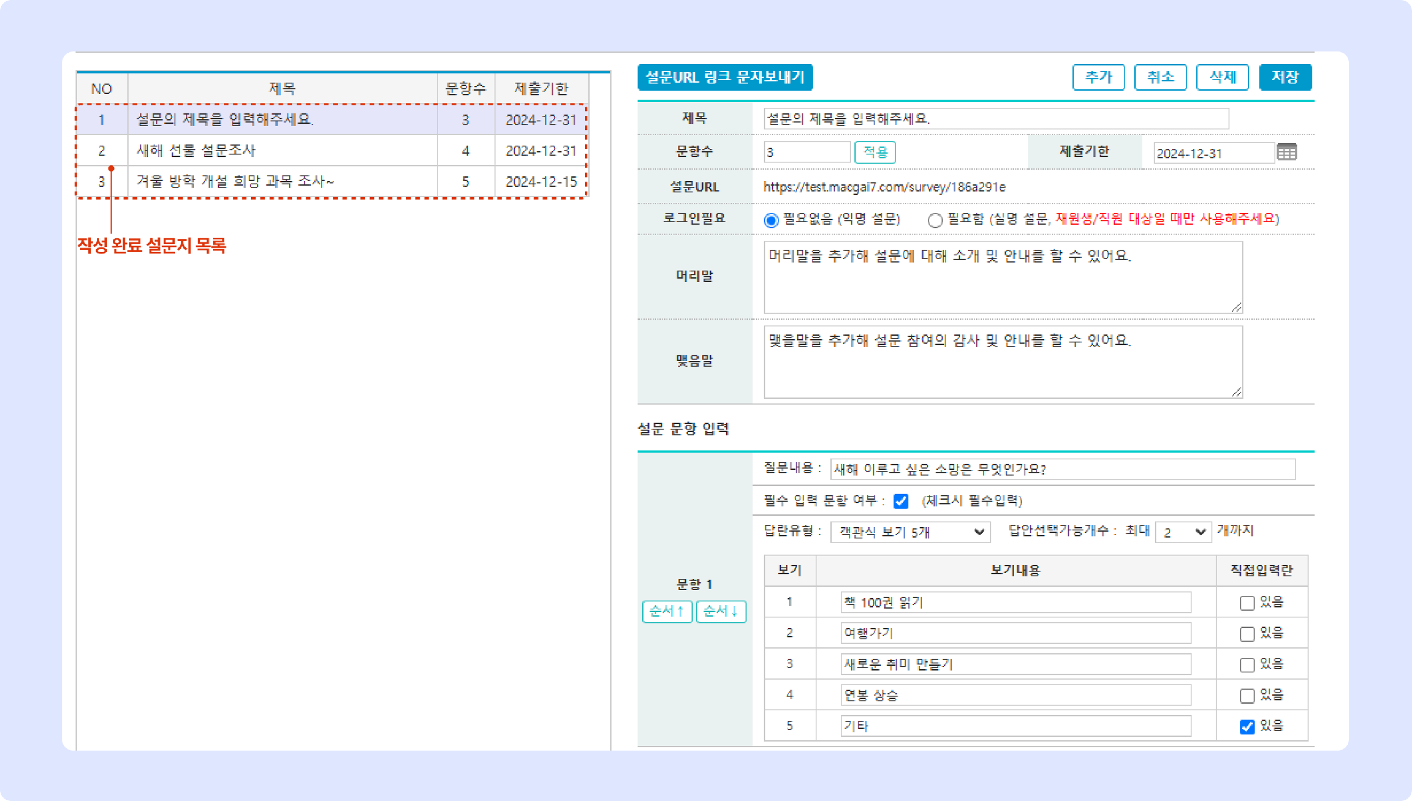 설문작성이 완료되면 [저장] 버튼을 클릭합니다.