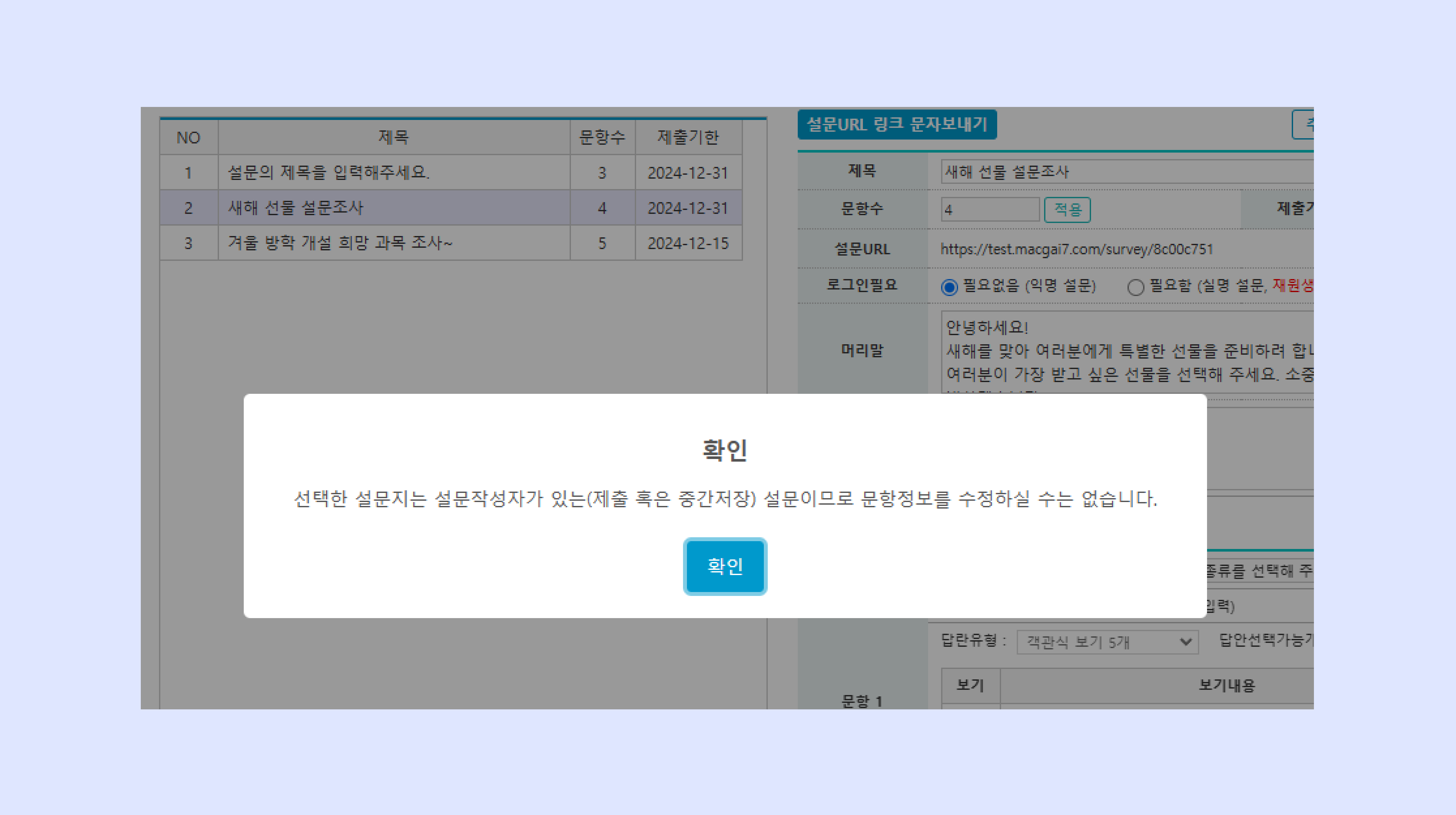 설문 제작 완료 시 자동으로 설문URL이 생성됩니다.