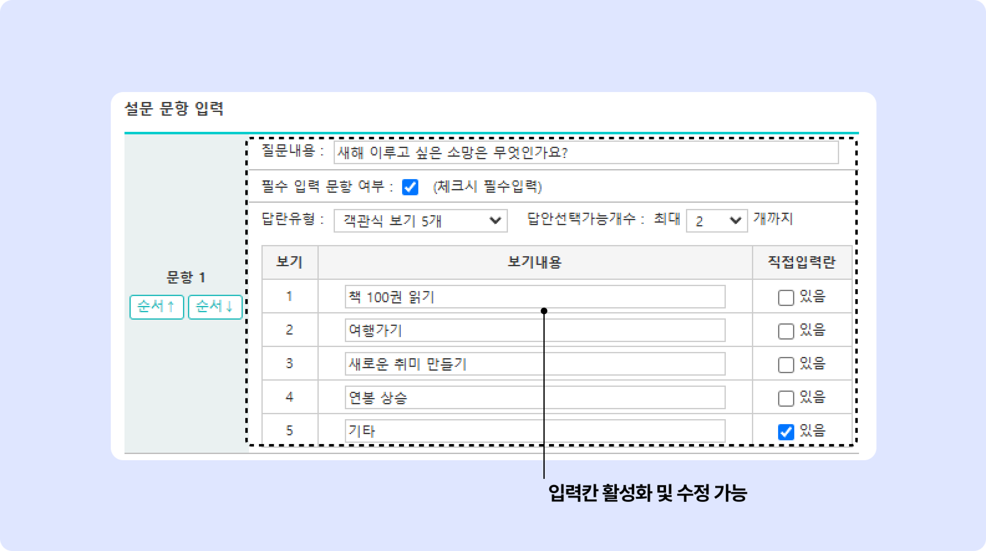 직접 입력란 체크 시 객관식 문항에서도 추가적인 정보를 답변으로 받을 수 있습니다. 예) 기타:
