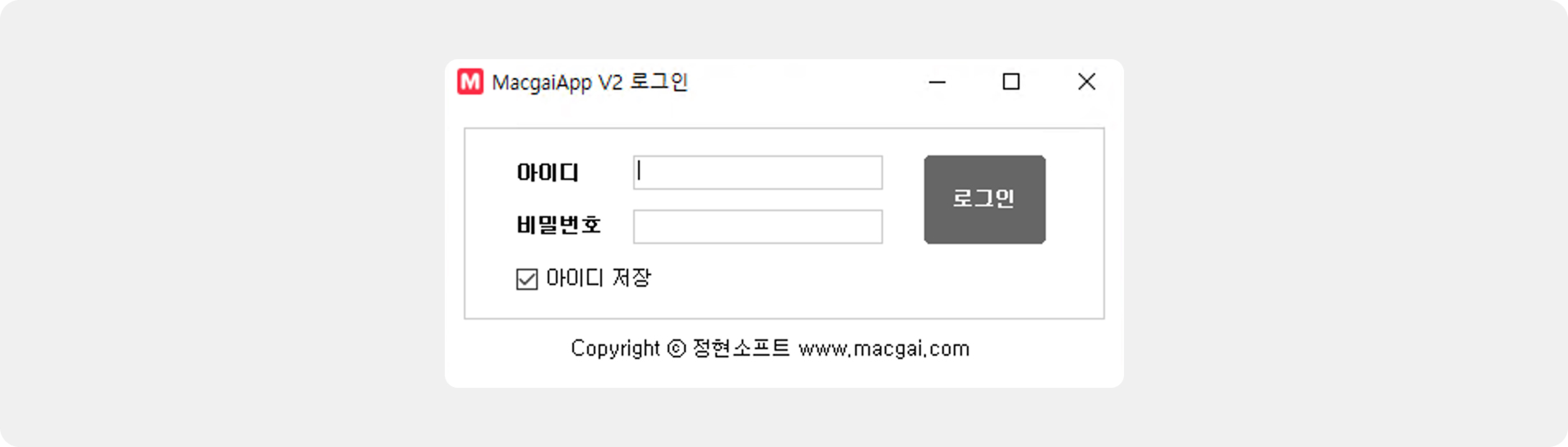 프로그램을 실행 후, 맥가이 접속에 이용하는 아이디를 이용해 맥가이 앱에 접속하시면 됩니다.