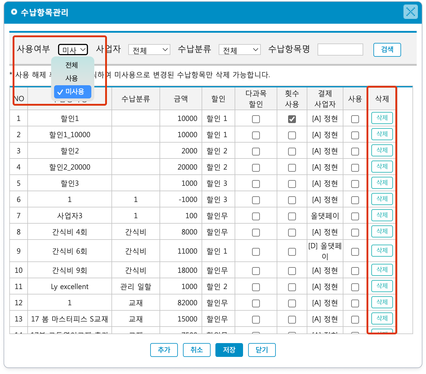 수납 항목을 삭제 합니다. 사용 해제 후 미사용 상태로 전환되면 삭제 버튼이 활성화 됩니다.