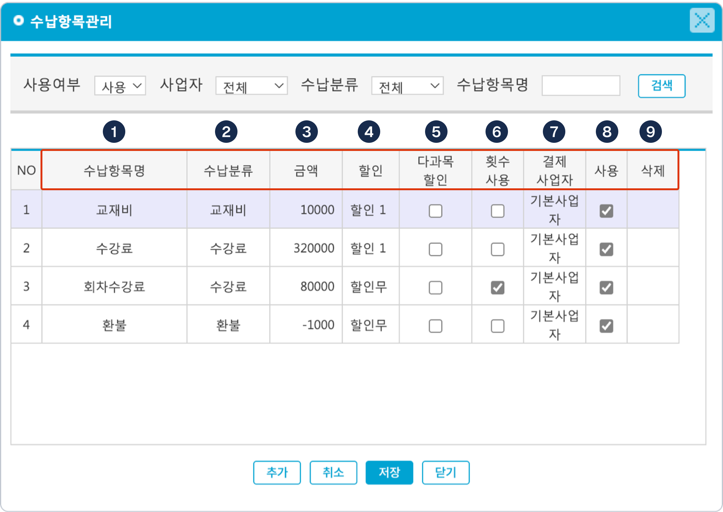 수납 항목 관리 팝업을 열어 [추가]를 눌러 필요한 정보를 입력하고 [저장] 합니다.