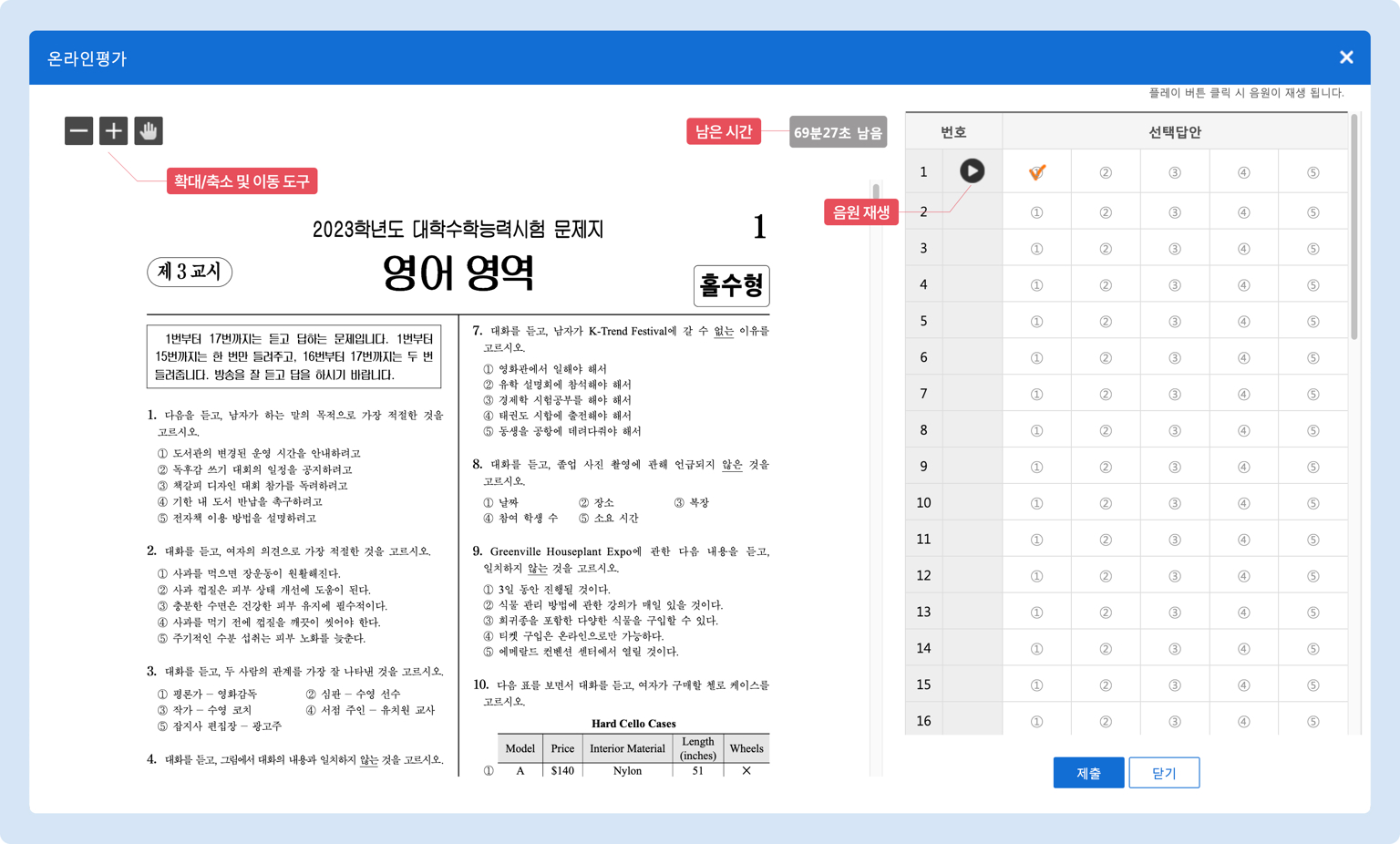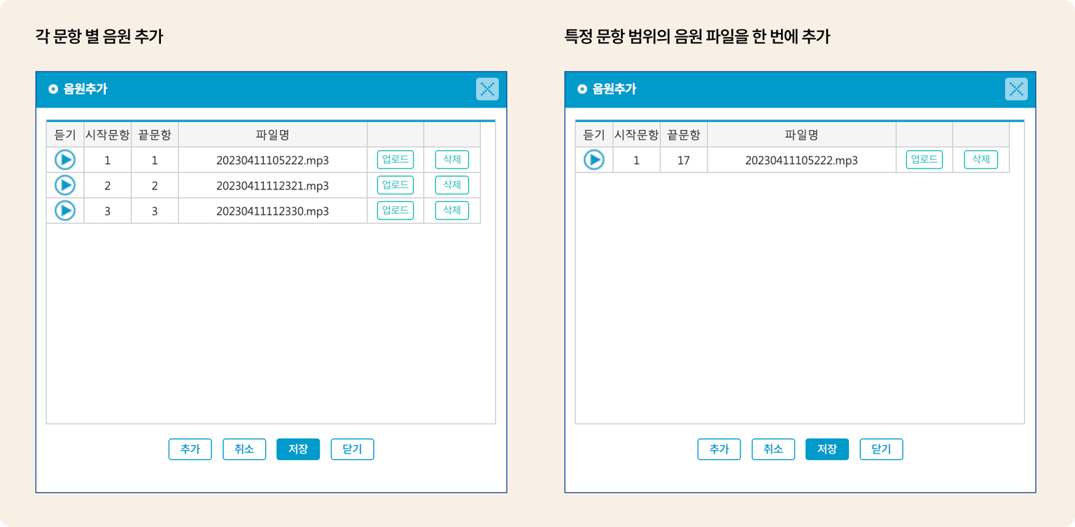 음원 추가: 듣기 평가 음원(mp3 파일 형식만 가능)을 업로드합니다. 각 문항 별로 음원을 추가하거나, 특정 문항 범위의 음원을 한꺼번에 올릴 수 있습니다.