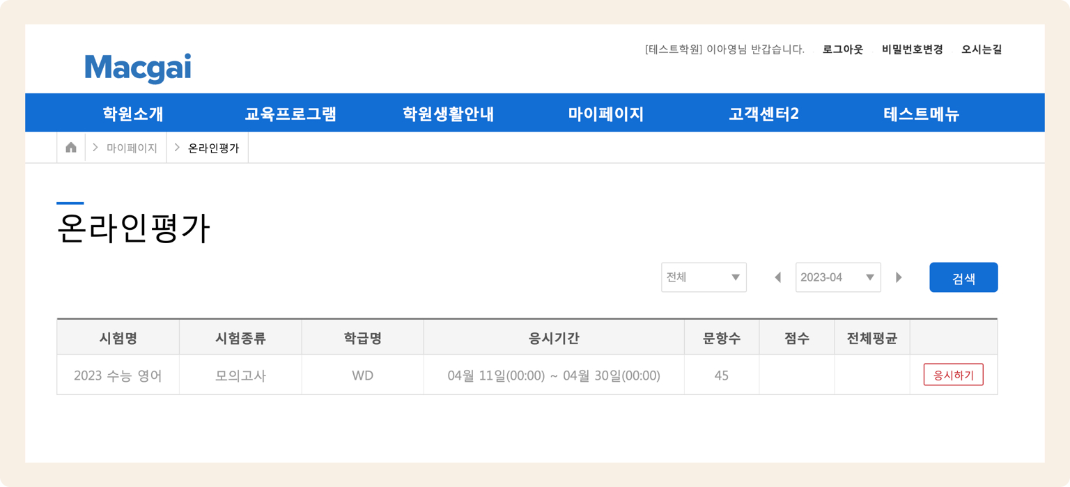 (학생) 학원 홈페이지로 이동 하여 로그인 후 온라인 평가 프로그램이 설정된 메뉴로 이동합니다. 메뉴 명은 임의 변경이 가능하므로 학원마다 다를 수 있습니다.