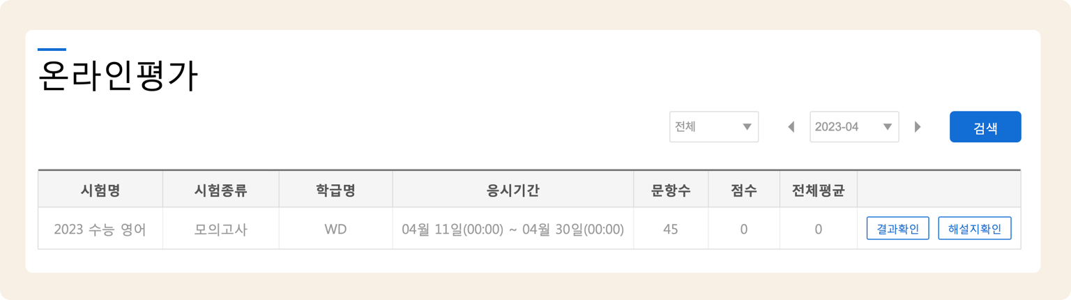 온라인 평가 설정에서 성적 결과 옵션을 '결과만 노출'로 선택했을 시 결과 확인에서 시험지는 보이지 않습니다.