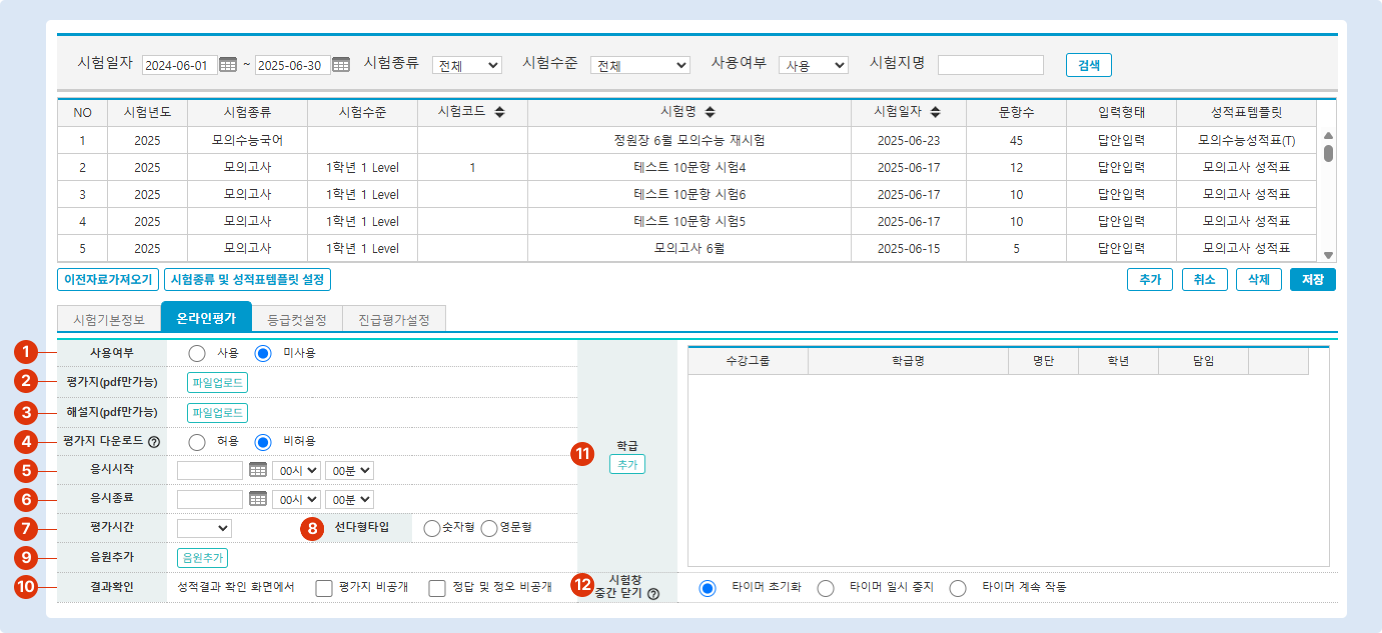 이용메뉴: 기본메뉴 → 수업관리 → 시험관리