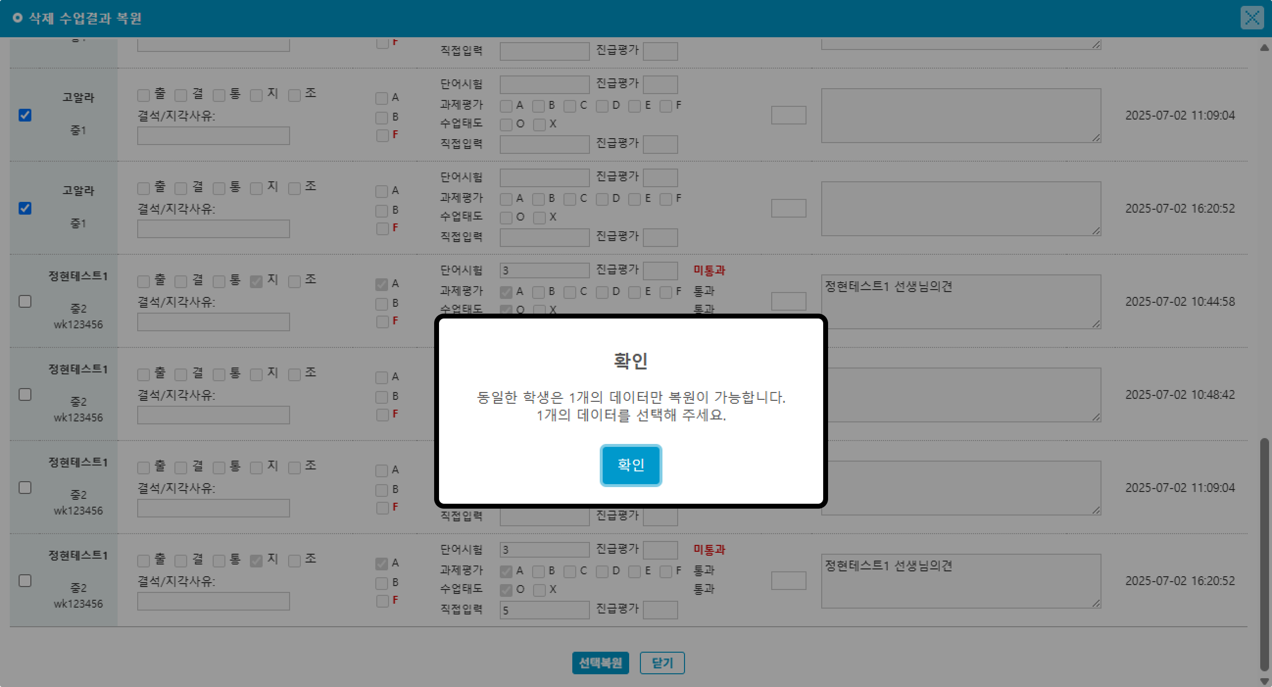 삭제된 데이터가 누적되기 때문에 동일한 학생의 다수 데이터가 존재할 수 있어요. 중복 학생의 데이터를 ✅체크한 후 복원처리를 진행하면 동일한 학생의 중복 처리가 불가능한 대화 상자가 노출되며, 동일한 학생은 복원을 원하는 하나의 데이터만 선택할 수 있어요.
