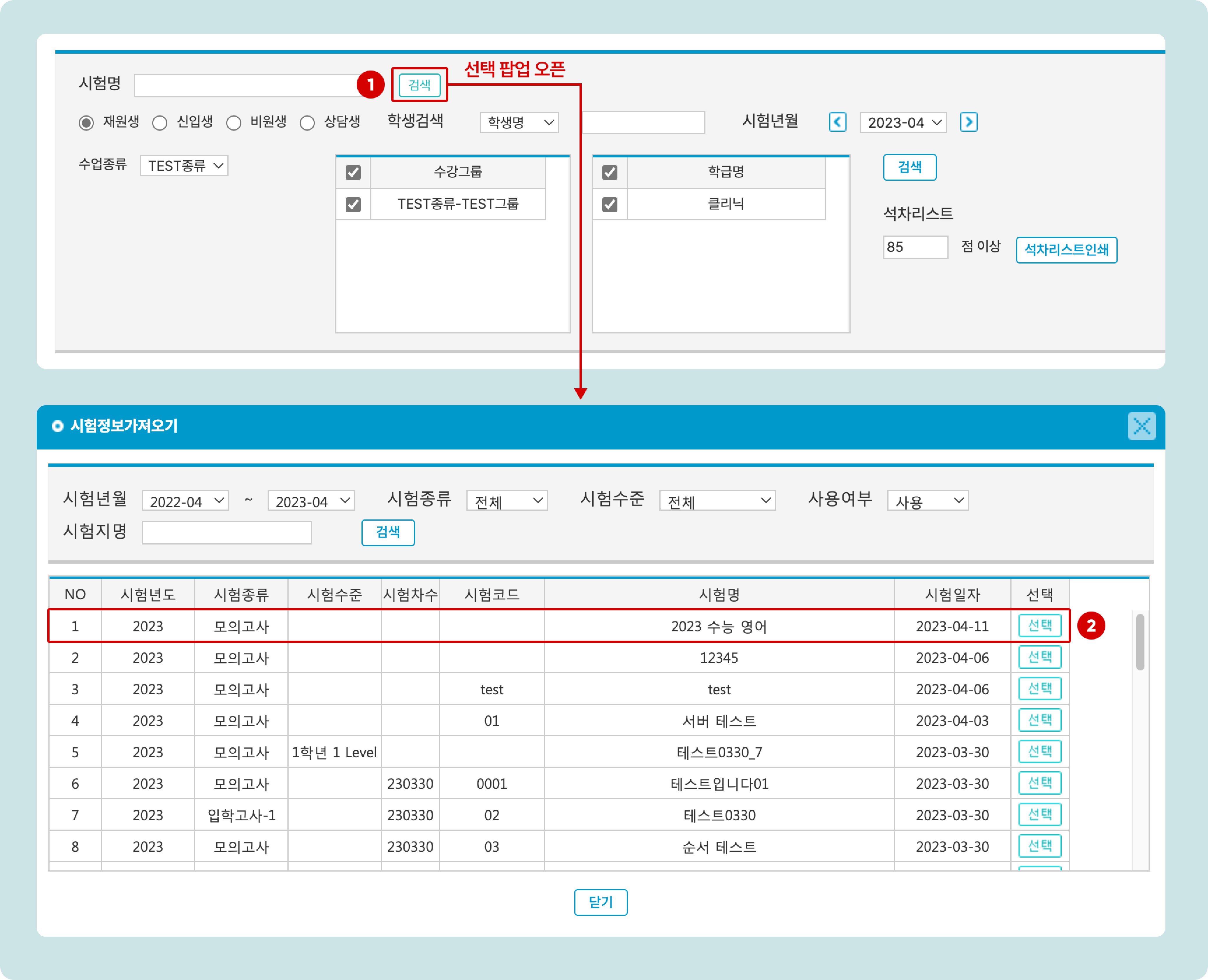 1. 검색 버튼을 눌러 시험 선택 팝업을 엽니다.