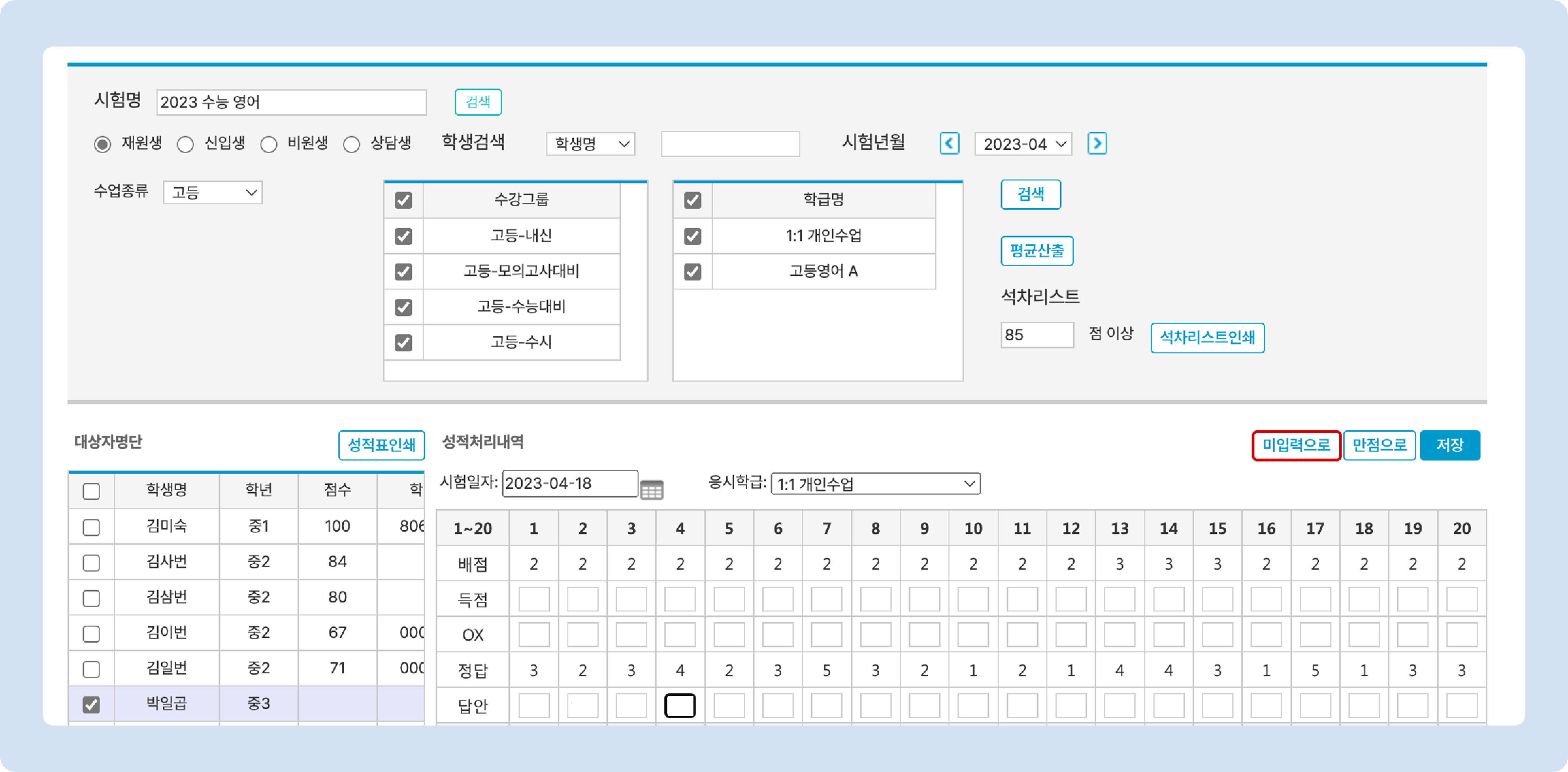 특정 점수가 입력 된 학생을 선택 후 [미입력으로] 버튼을 눌러 모든 채점 정보를 삭제하고 [저장] 합니다. 입력 값이 없으면 0점이 아닌 시험을 진행하지 않은 것으로 처리됩니다. (성적 분석에 나타나지 않음)