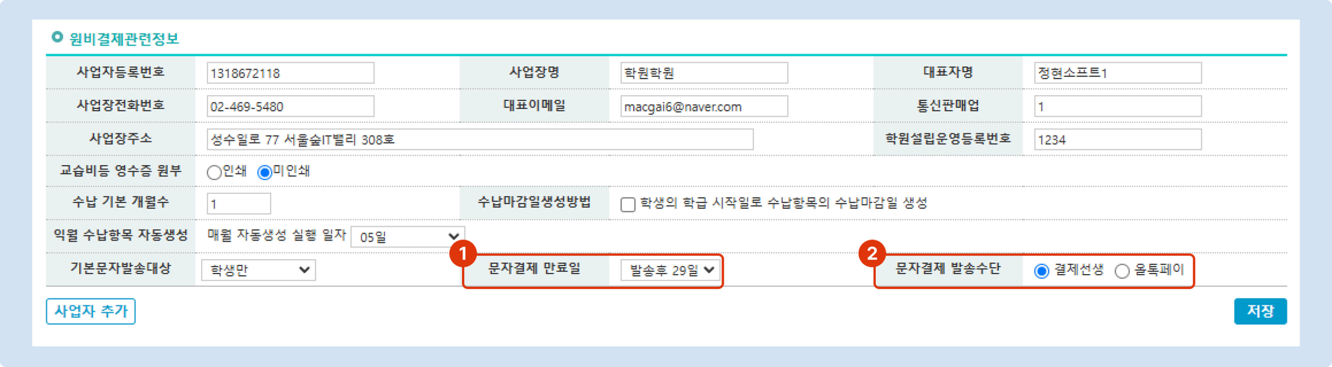 최초 발송 전 먼저 청구서 자동 파기 기한(문자결제 마감일) 설정을 해주시는 것이 좋습니다.
