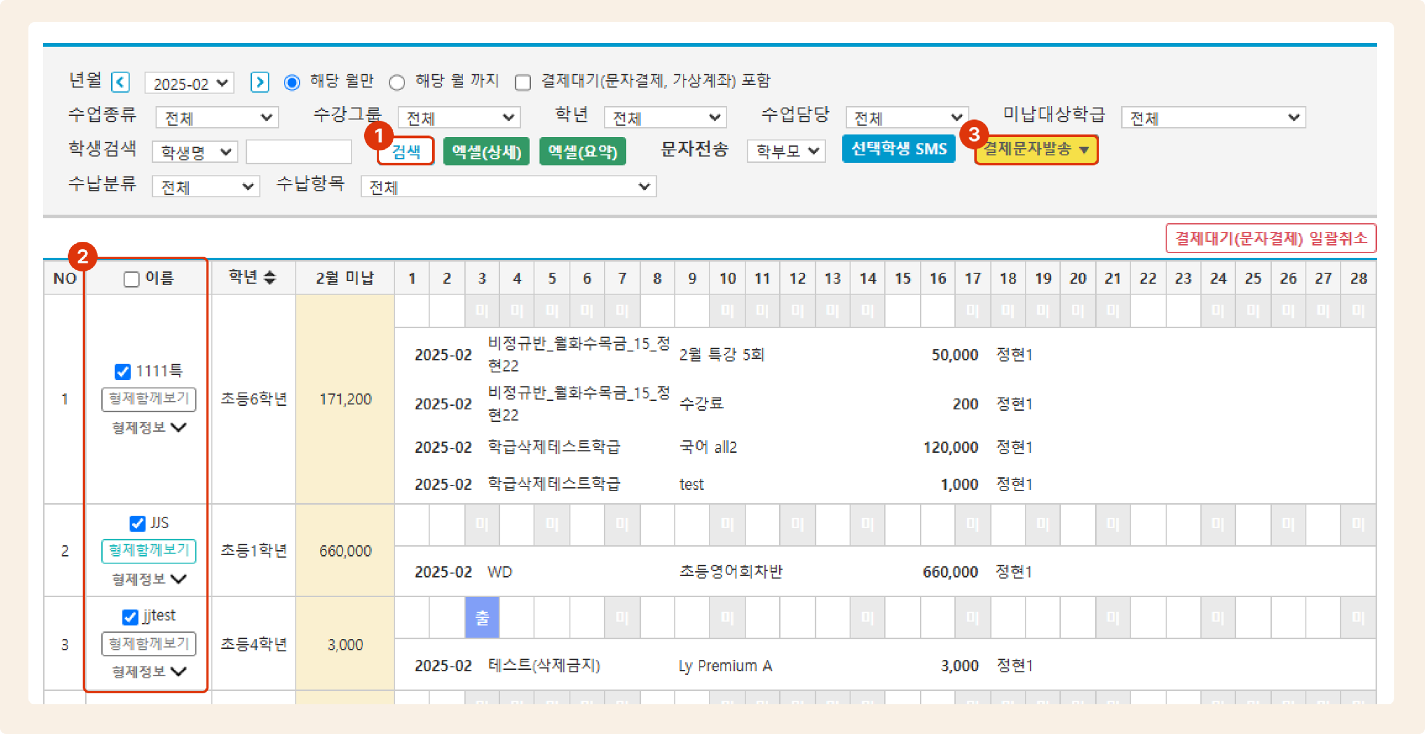 학생관리 또는 우측 검색 창을 이용해 학생을 검색 - 선택 후 결제 탭으로 이동합니다. 결제수단: 문자결제 / 결제상태: 결제대기로 되어 있으면 결제 선생 알림톡이 정상적으로 발송 된 것입니다.