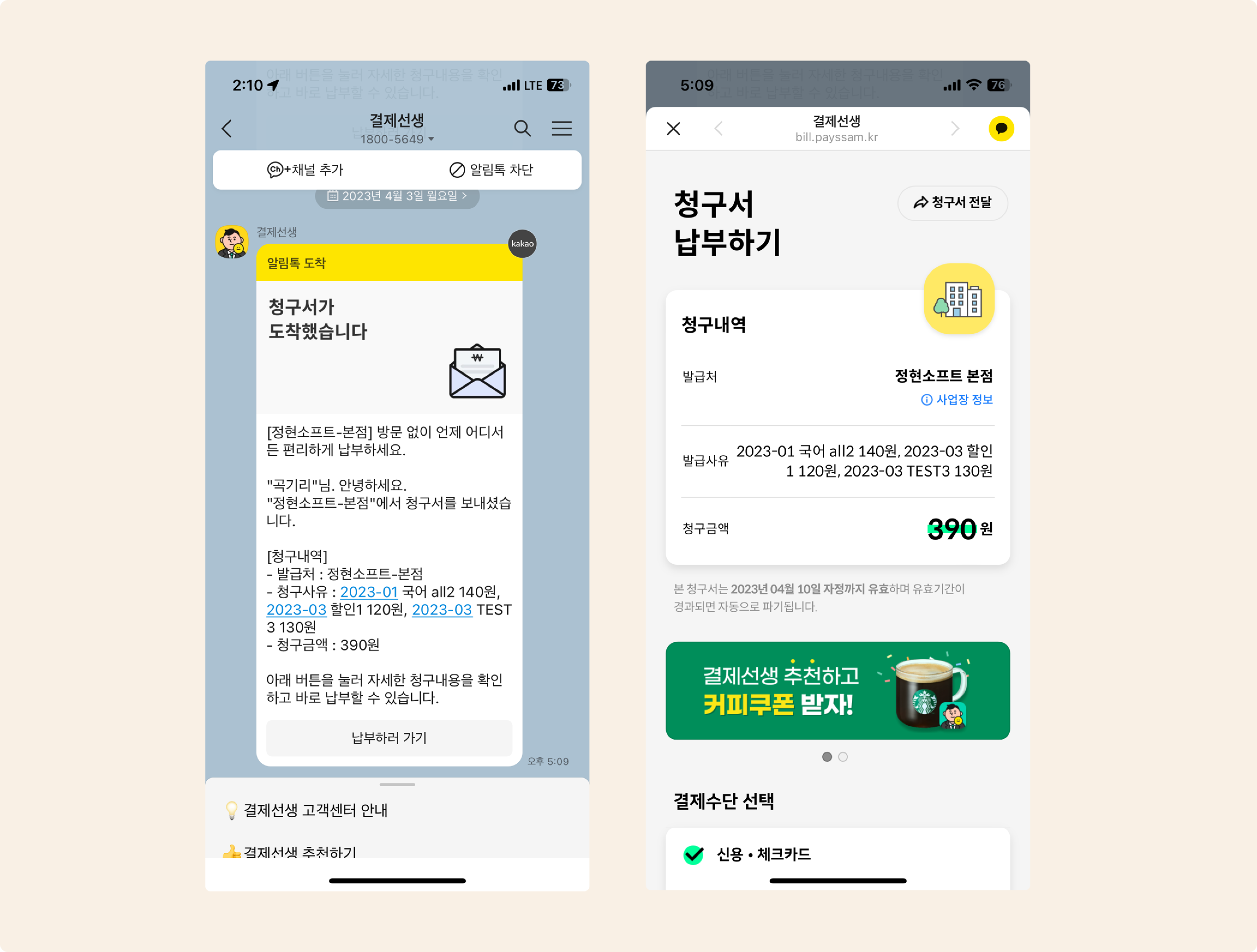 학부모님은 아래의 이미지와 같이 알림톡을 받고 결제를 진행할 수 있습니다.