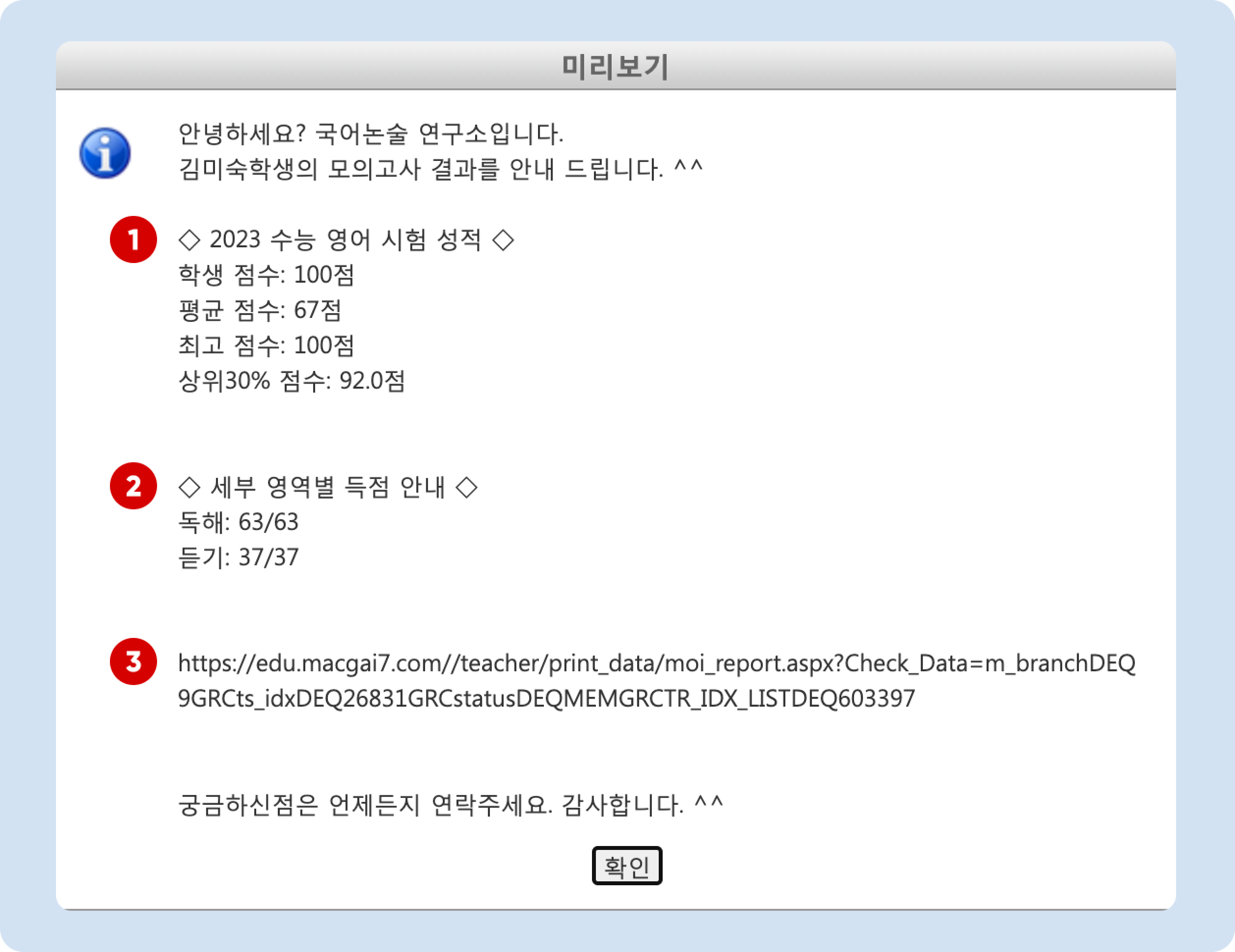 선택한 학생을 대상으로 성적결과 문자를 발송합니다. [치환값]을 이용해 내용을 직접 입력하거나 저장메시지를 이용하여 문자를 보내시면 됩니다. 발송 전, 전송대상자의 연락처 우측의 [미리보기]를 눌러 학생 별로 최종 도달하는 문자의 내용을 보실 수 있습니다.