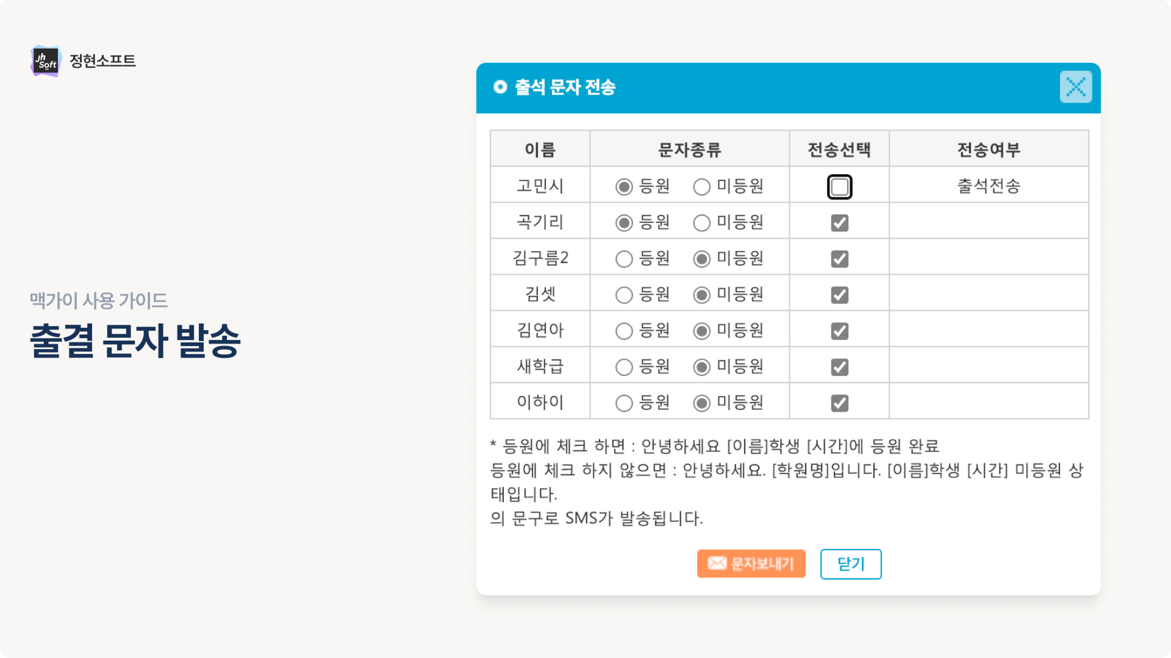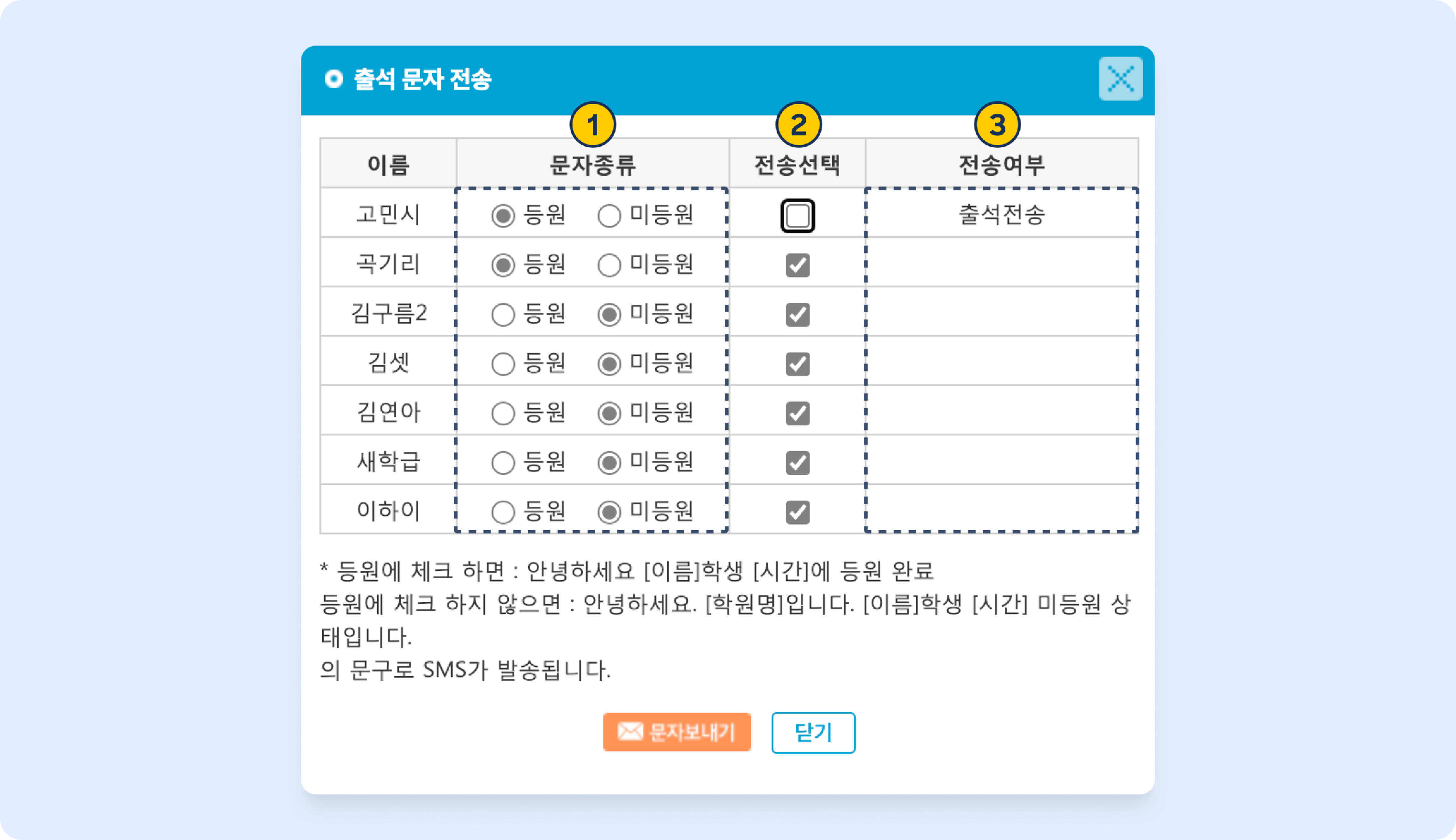 전송여부: 출석 문자의 전송 여부를 확인할 수 있어요.