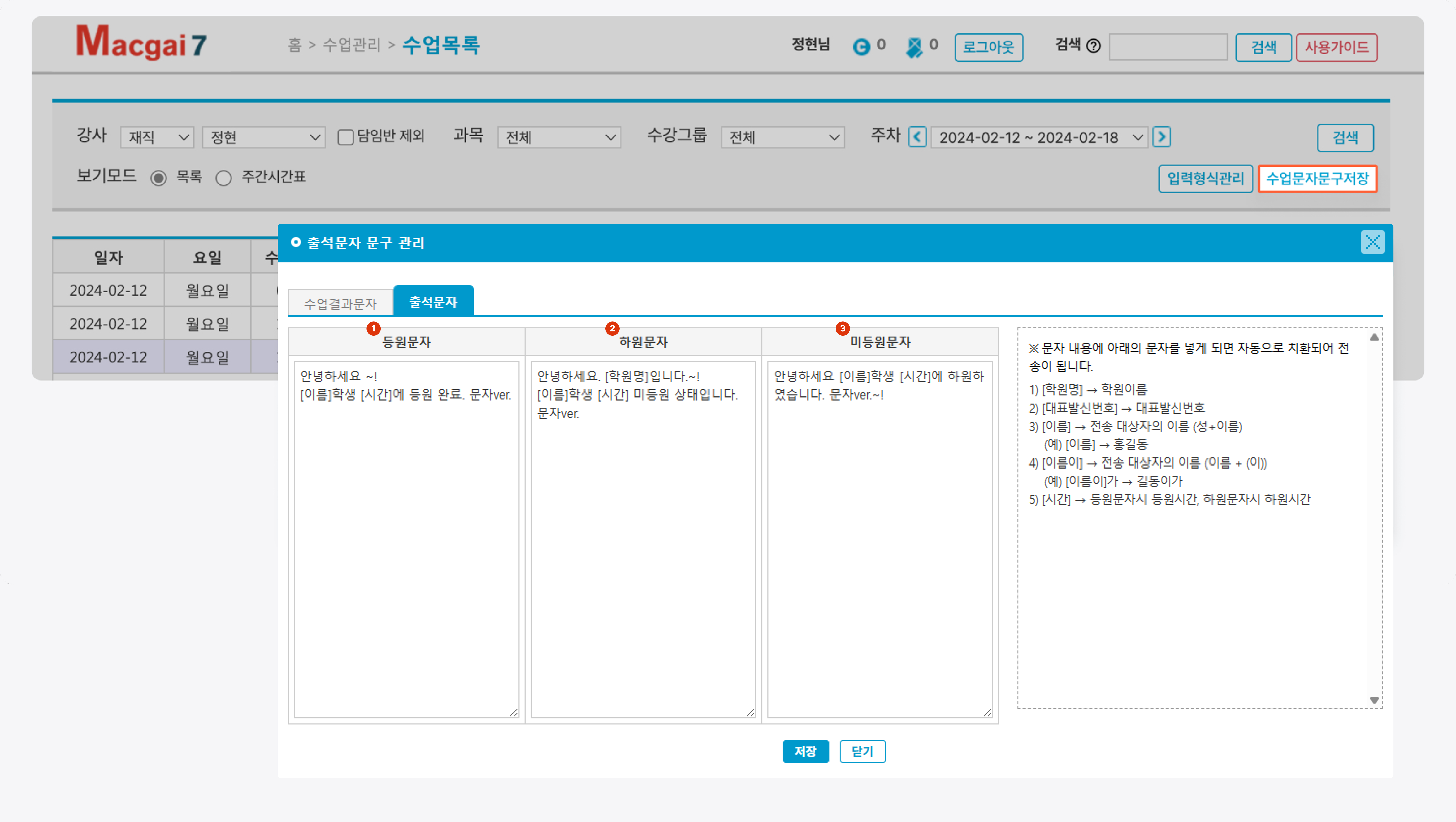 메뉴 우측 상단의 [수업문자문구저장] 을 눌러 출석문자 탭으로 이동 후 등원문자, 하원문자, 미등원문자, 수업결과문자의 전송 양식을 수정할 수 있어요.