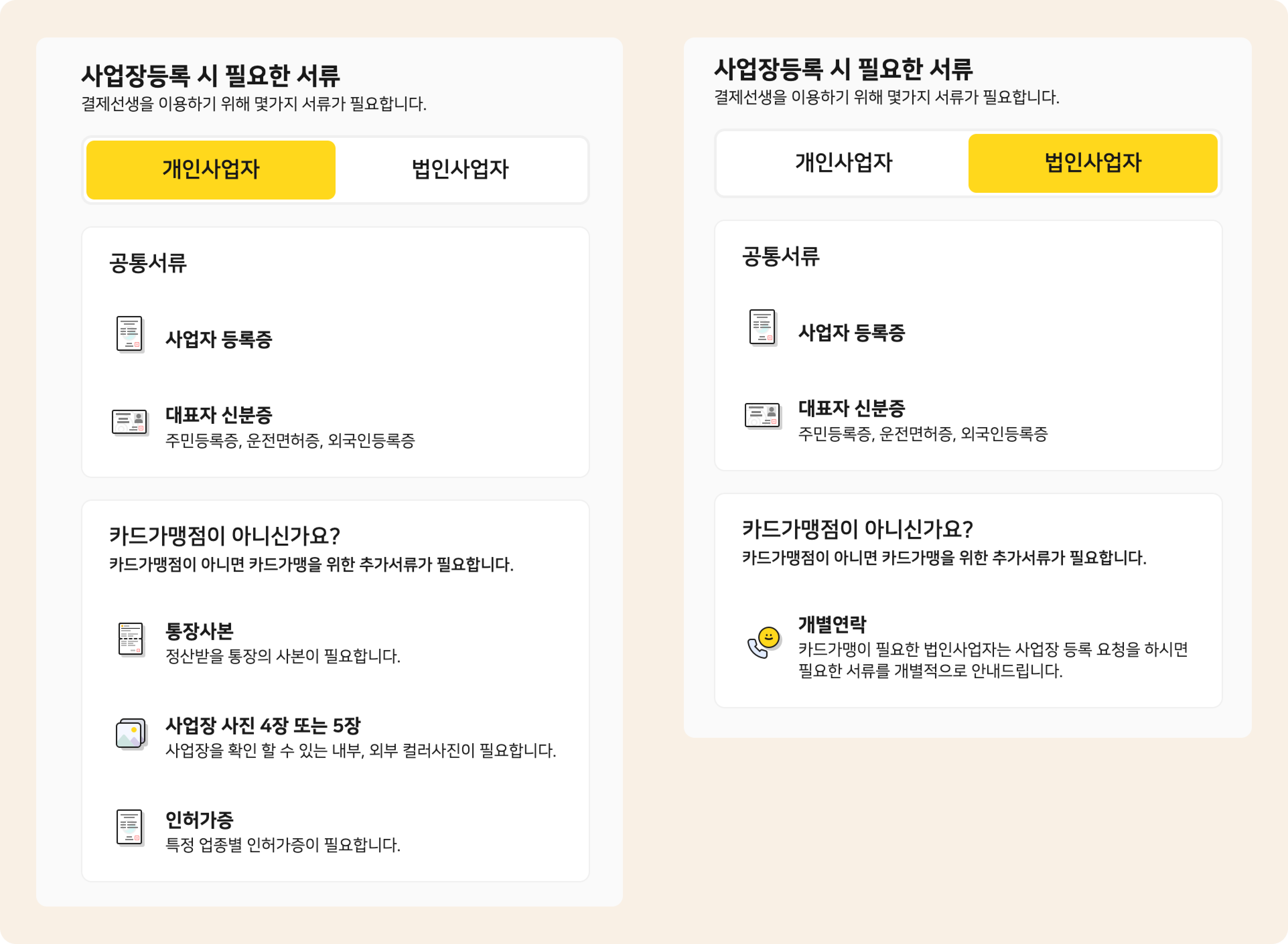 카드가맹점 여부에 따라 신청 시 필요 서류와 기간이 달라질 수 있습니다. 각 유형에 따라 필요한 서류는 아래의 이미지를 참고해주세요.