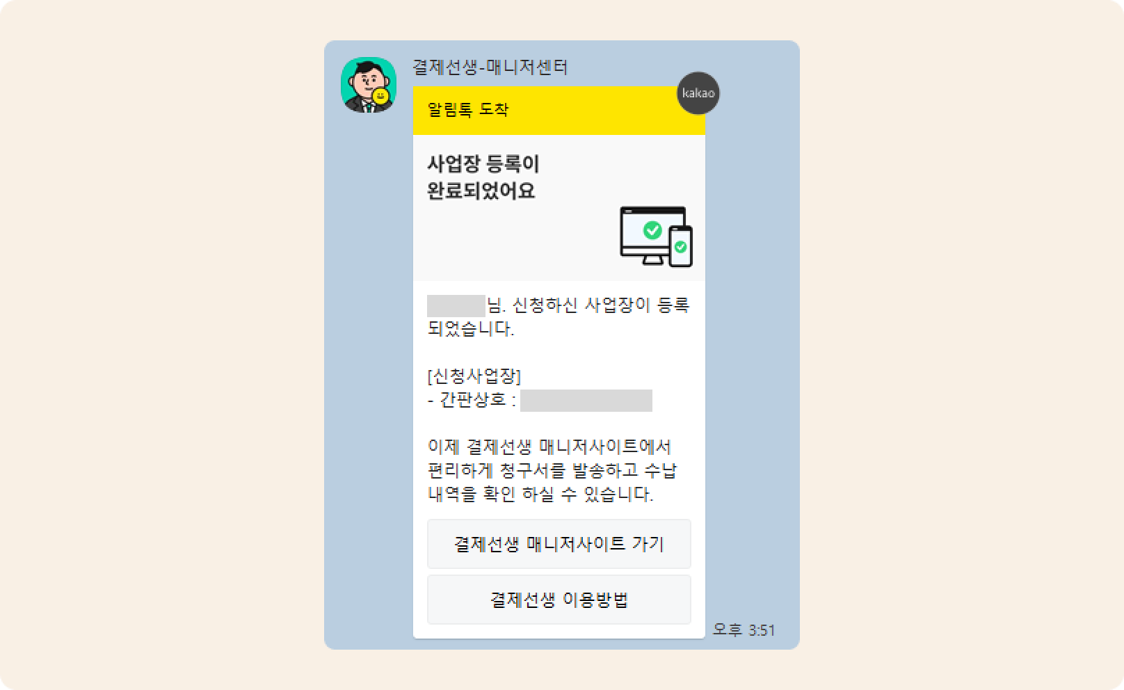 가입 승인이 완료 되면 대표자의 휴대폰으로 알림톡이 전달됩니다. 이제부터 맥가이에서 결제 선생 연동 서비스를 사용하실 수 있어요.