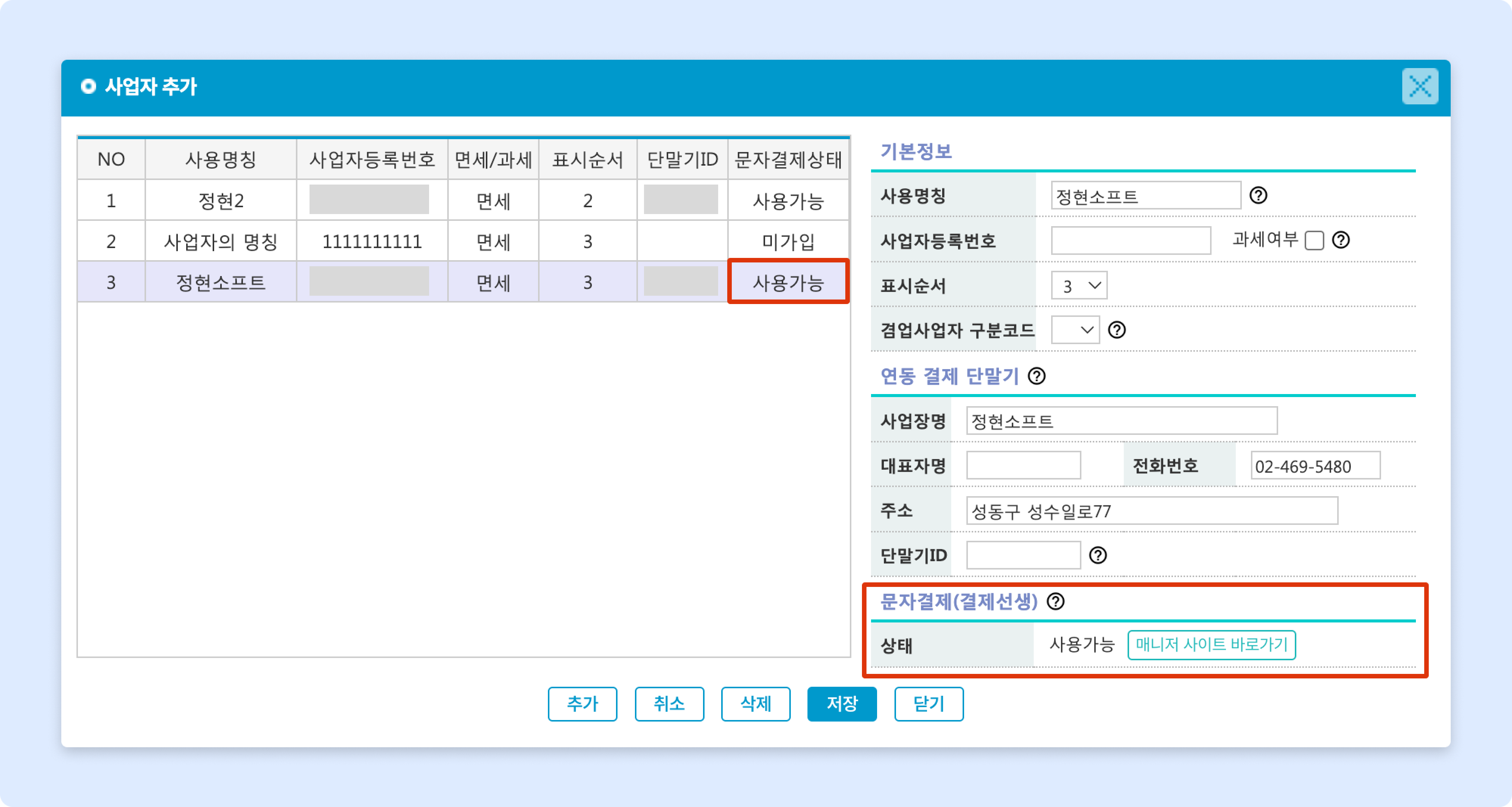 학원정보관리 메뉴의 [사업자추가] 로 들어갔을 때 문자결제상태 열이 사용가능으로 되어 있다면 결제 선생 연동 서비스를 사용하실 수 있어요.