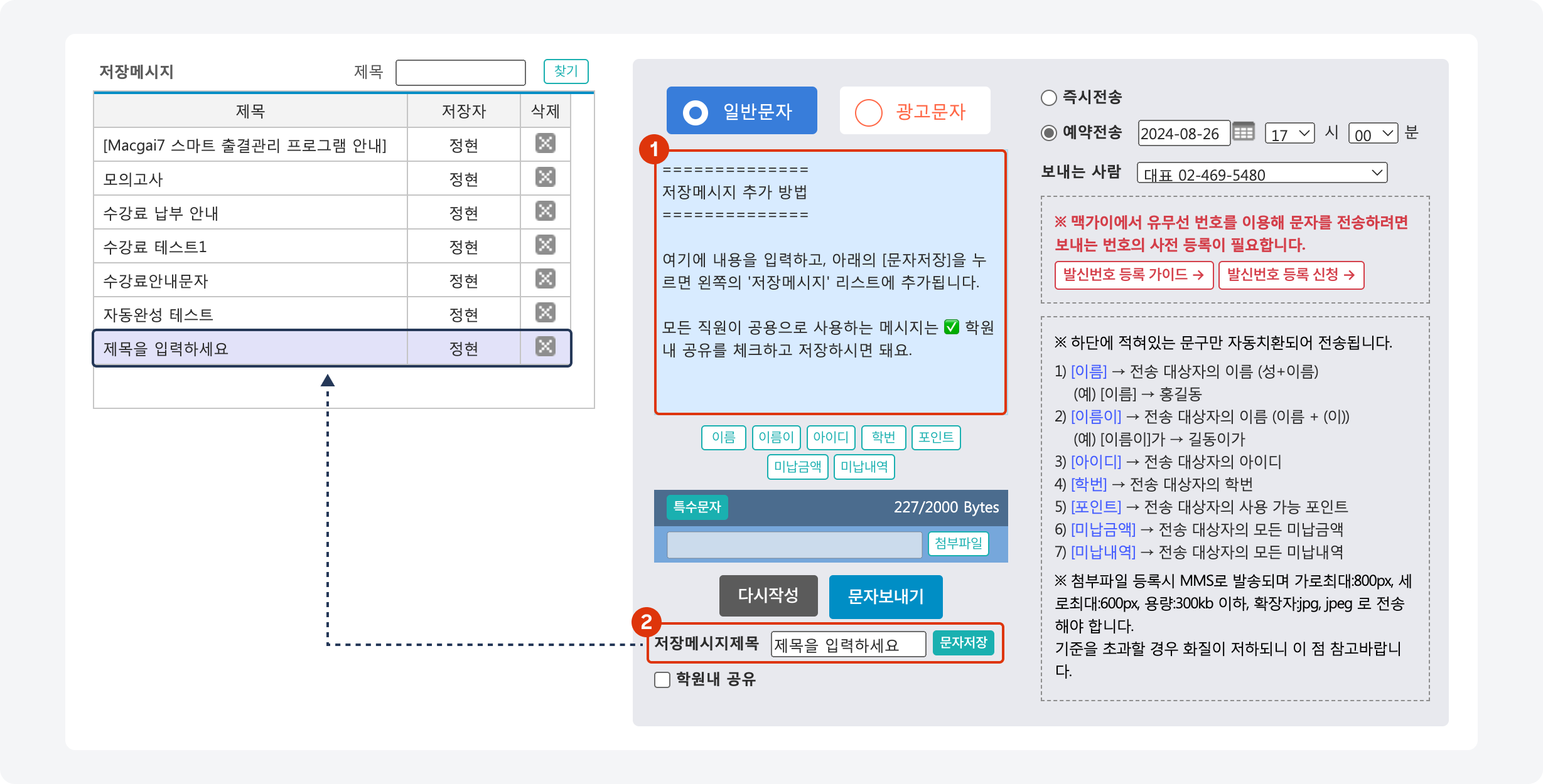 학원 내 공유를 체크한 상태에서 저장하면 모든 직원이 저장 메시지를 사용할 수 있습니다.