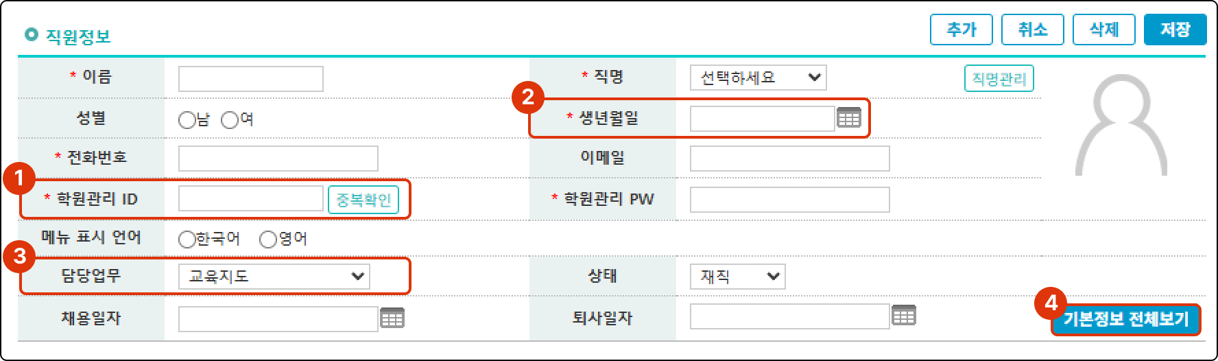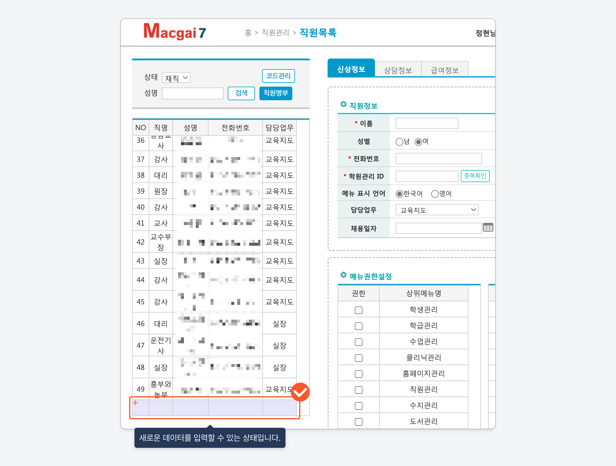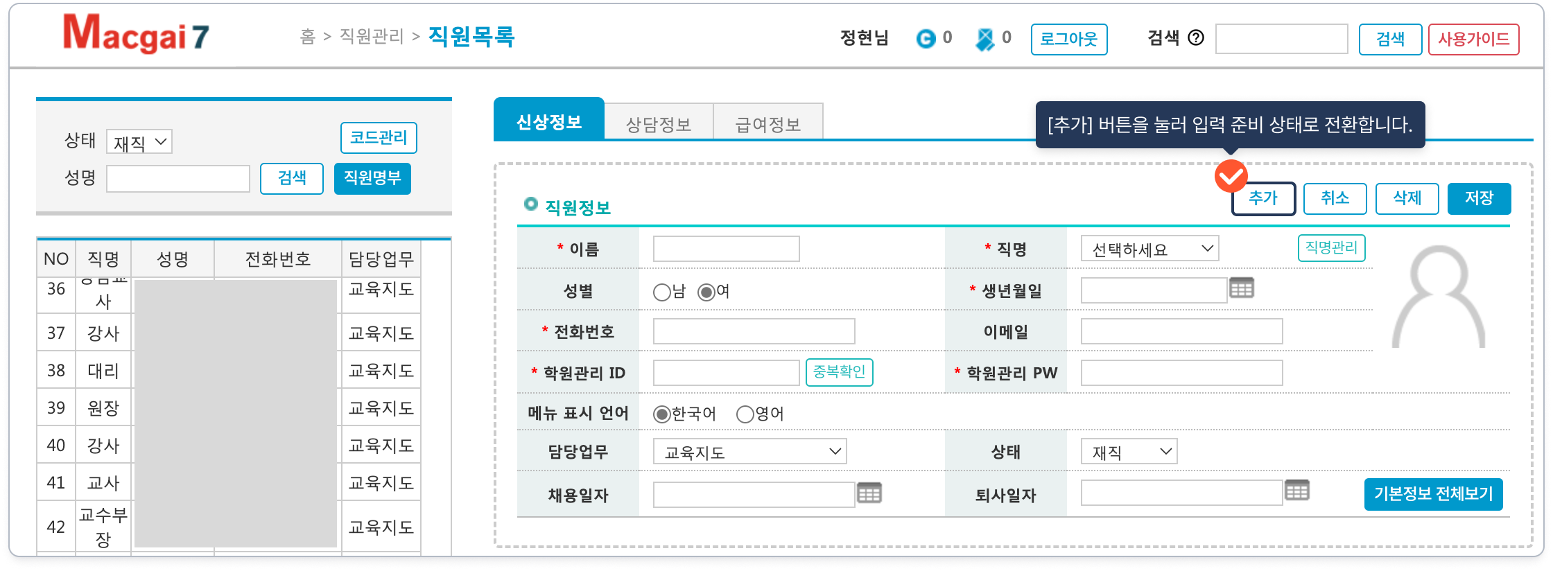 개별 직원 혹은 강사가 맥가이를 사용하려면 직원의 정보를 추가해야 합니다