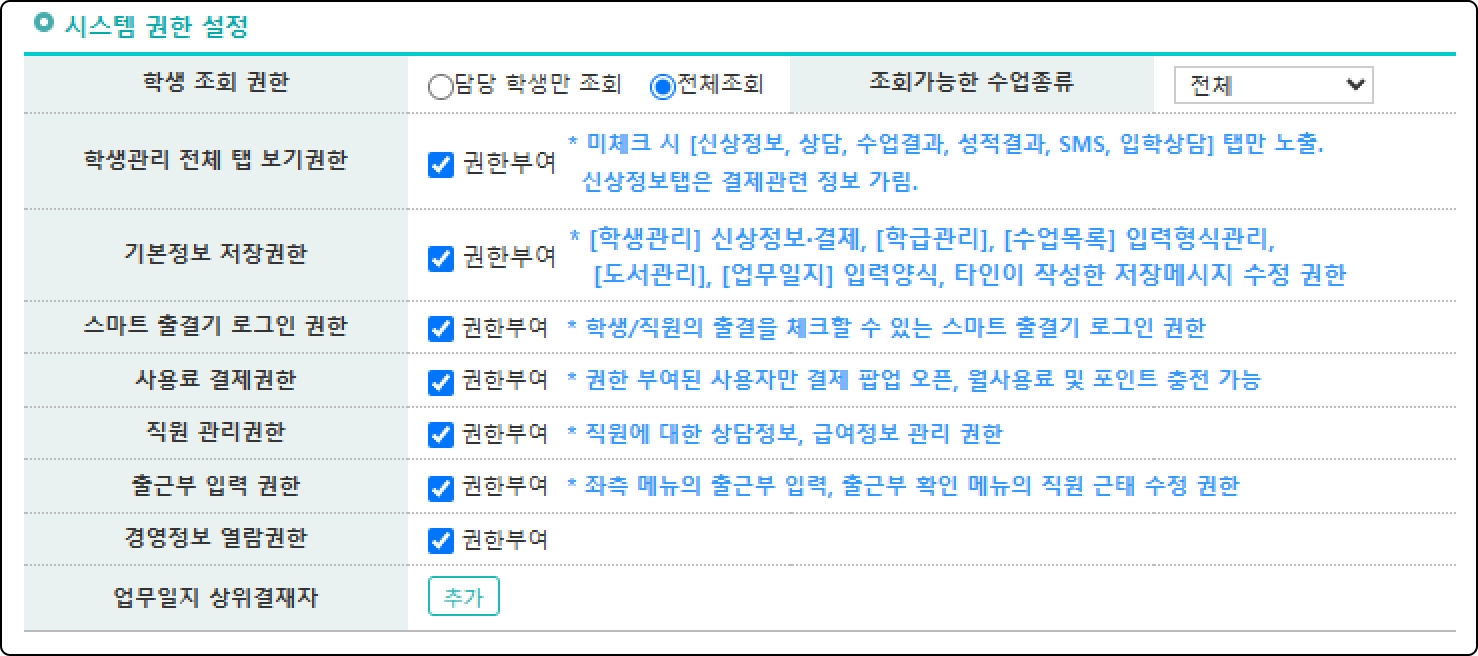 개별 메뉴에 대한 접근 권한을 설정할 수 있어요. 학원의 운영 방향에 맞게 적절히 부여하시면 됩니다.