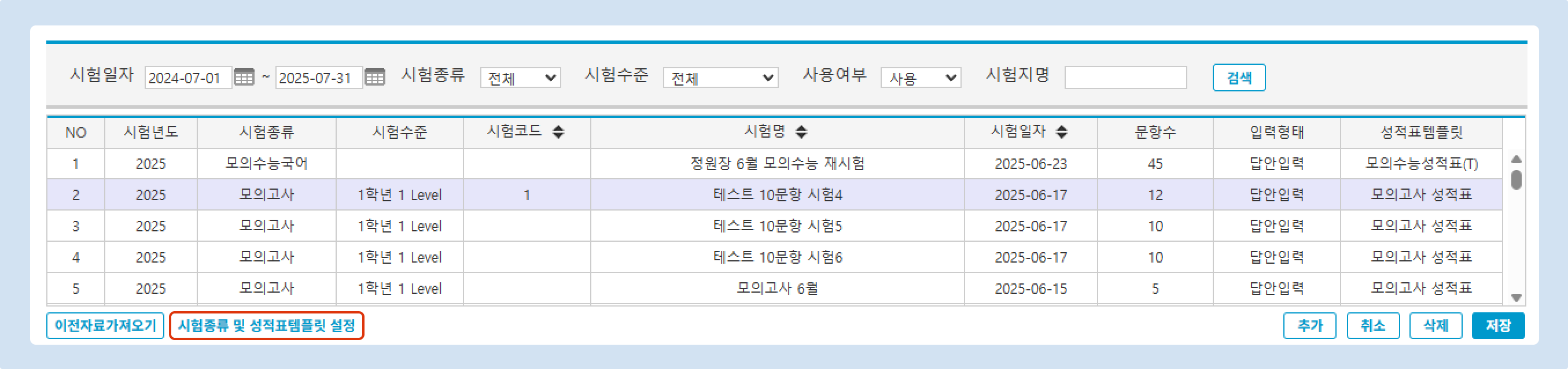 • 성적표템플릿: 해당 시험종류에서 사용하는 성적표 양식. 실제 성적표 양식은 시험종류가 아닌 성적표템플릿에 따라 달라집니다. 성적표템플릿 설명