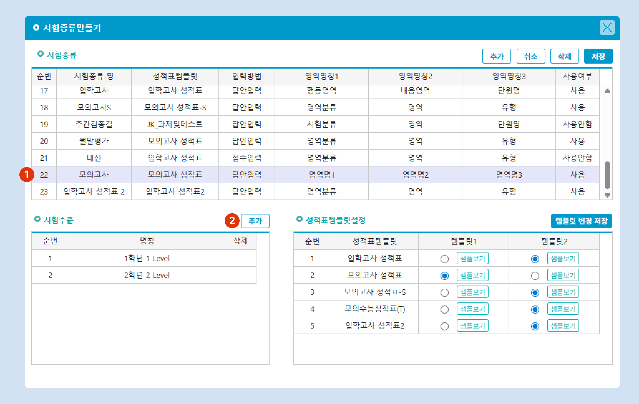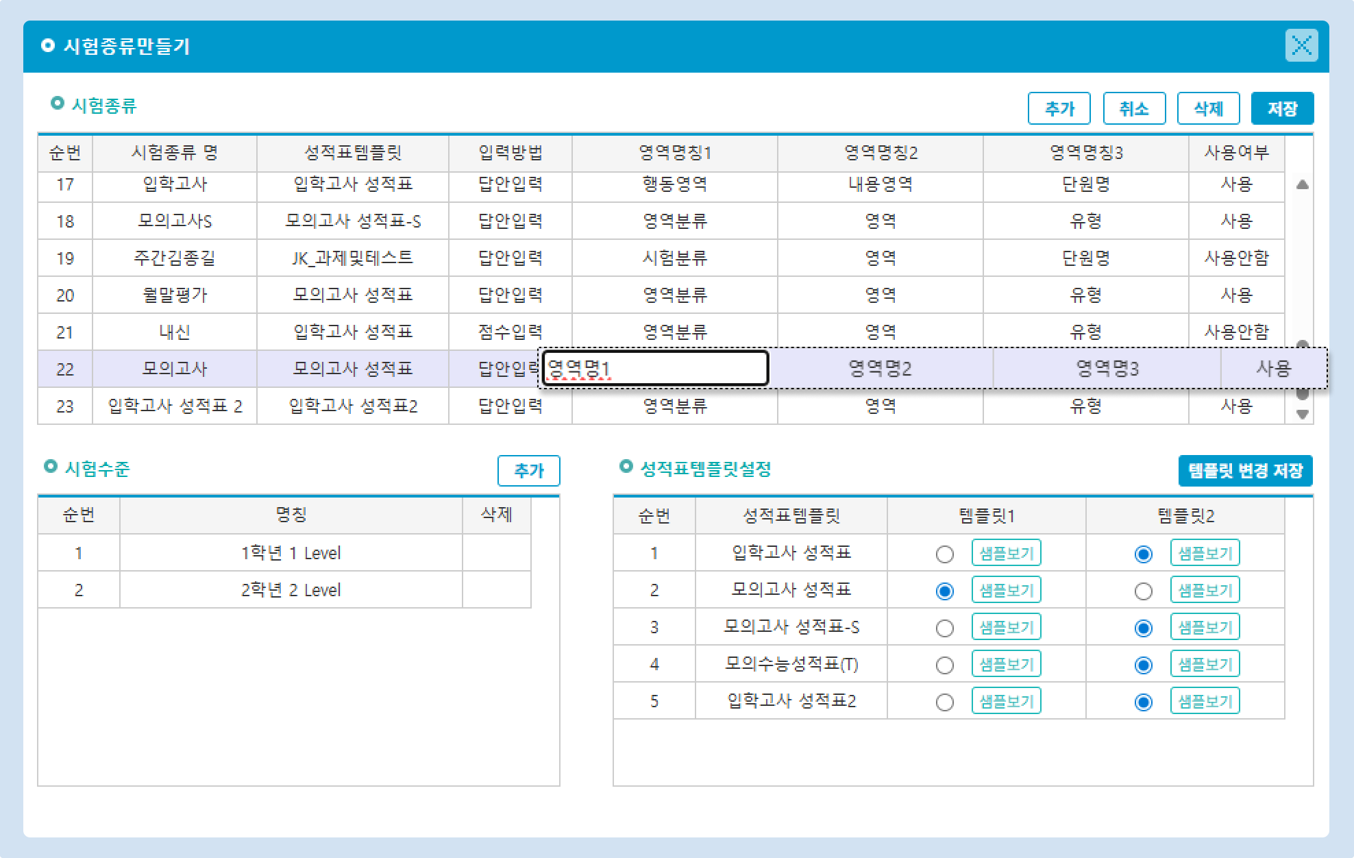 2. 아래의 시험수준 목록의 [추가] 버튼을 눌러 명칭 항목에 시험수준의 이름을 입력합니다