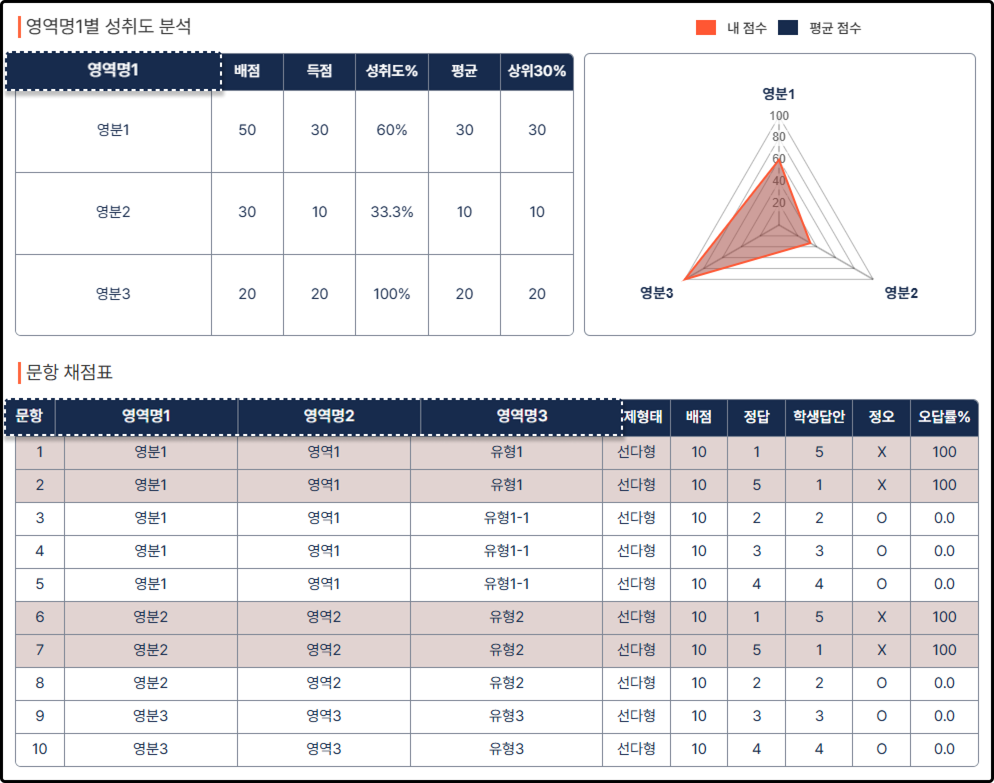 시험종류 세팅을 이용해 개별 시험의 성적표 형식, 영역 분류 명칭을 변경할 수 있습니다. 각 시험 종류의 하위 항목으로 시험수준을 추가할 수 있으며, 시험 종류와 시험수준이 동일한 시험은 진행 날짜 순으로 성적 추이를 확인할 수 있습니다.