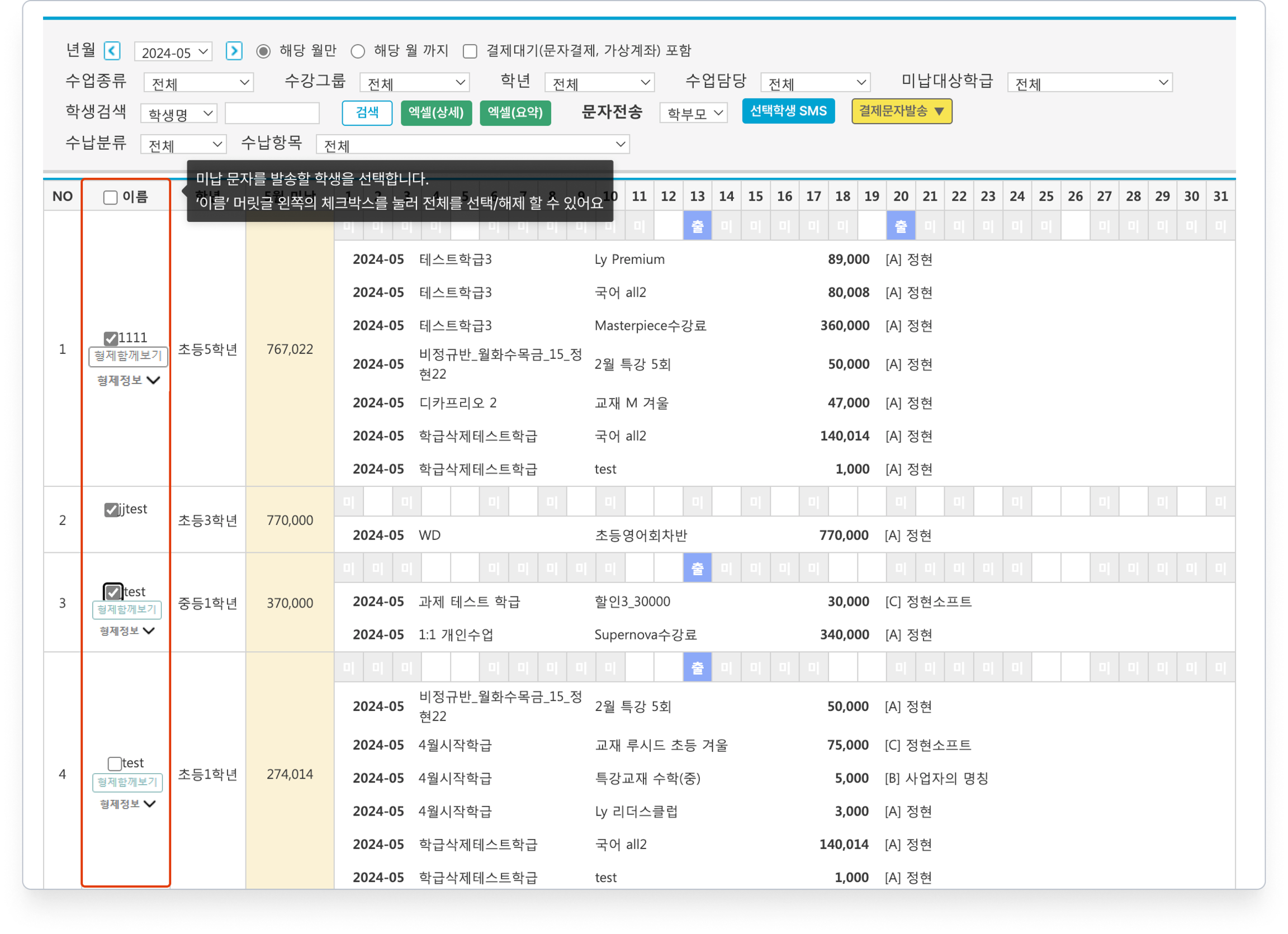 검색 된 학생을 대상으로 미납 안내 문자를 발송할 수 있습니다.