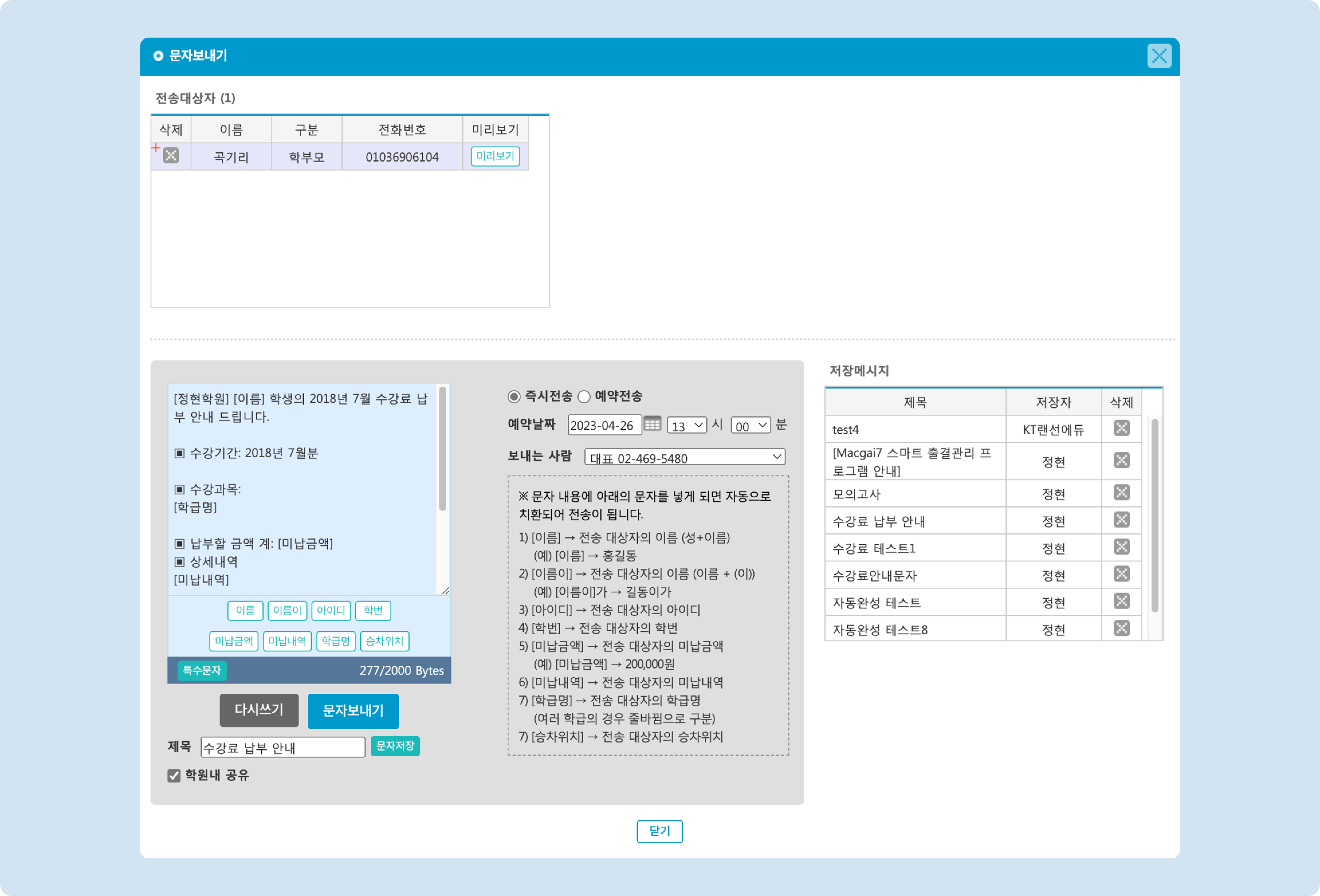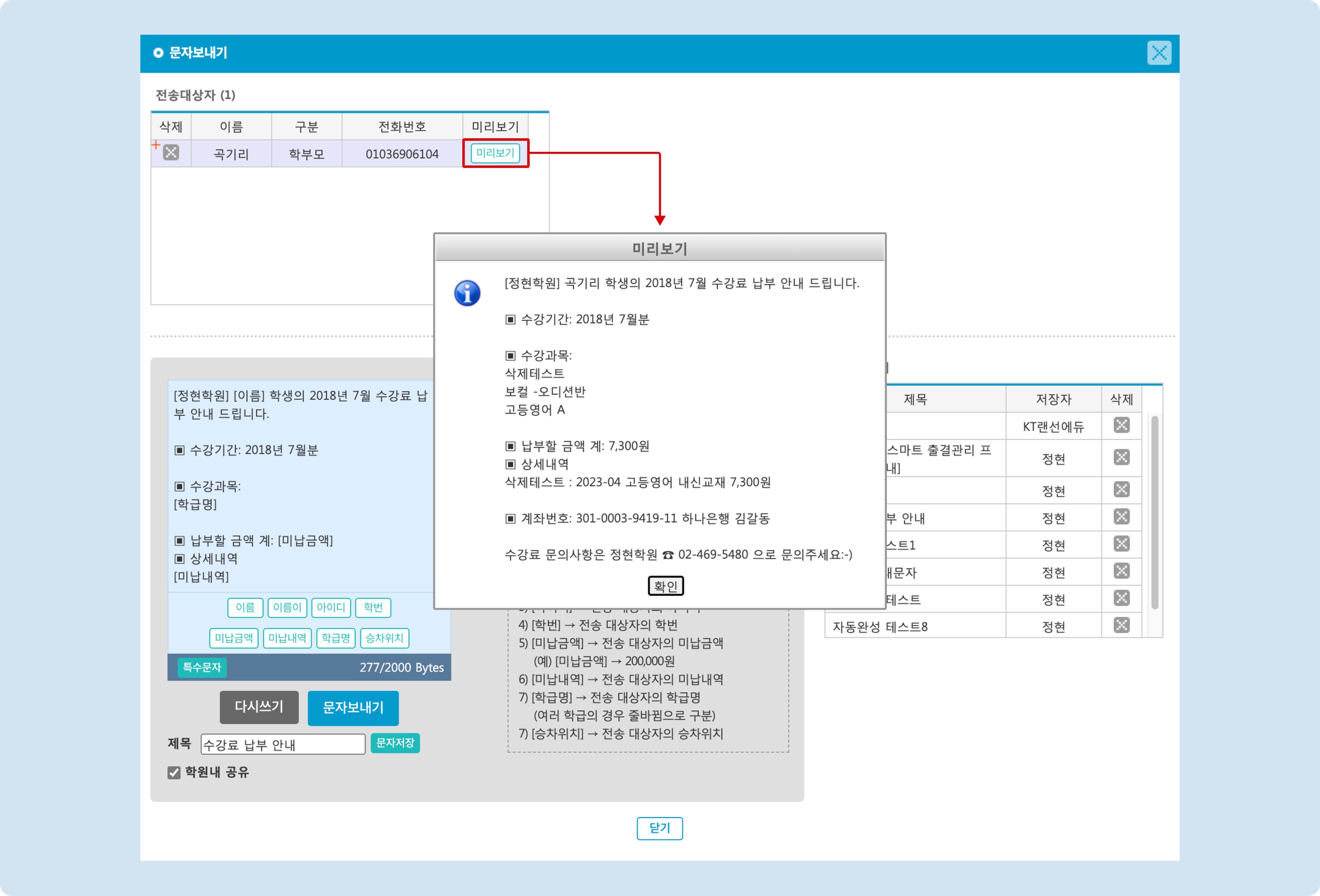 발송 전 미리보기를 이용해 보낼 문자 내용을 체크 해보는 것을 권장드립니다. [치환값]을 사용했을 경우 개별 학생이 어떤 문자를 받을 지 보실 수 있습니다.