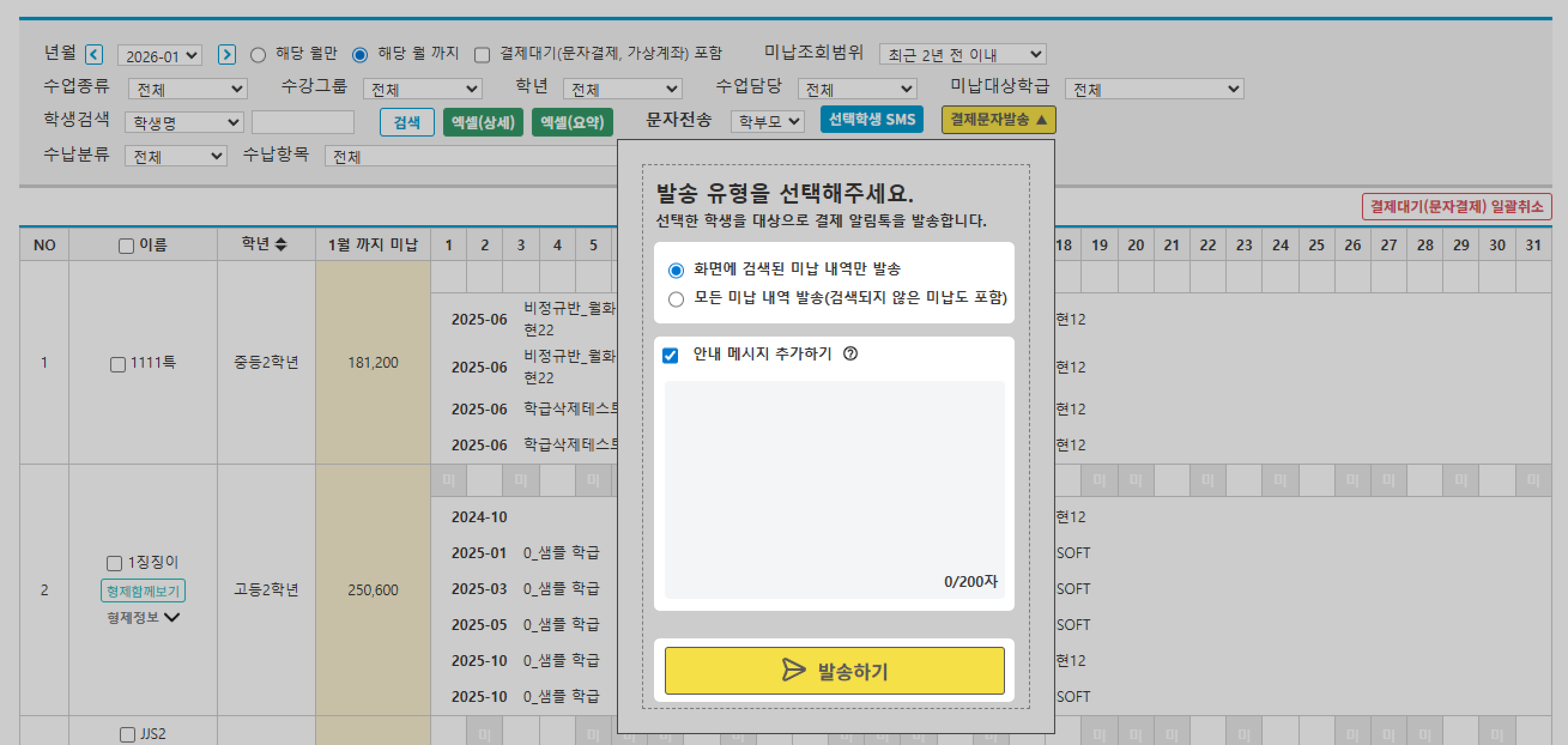 검색 된 학생의 모든 미납 내역을 발송: 검색 조건과 관계 없이 선택한 학생의 모든 미납 내역을 일괄 발송합니다.