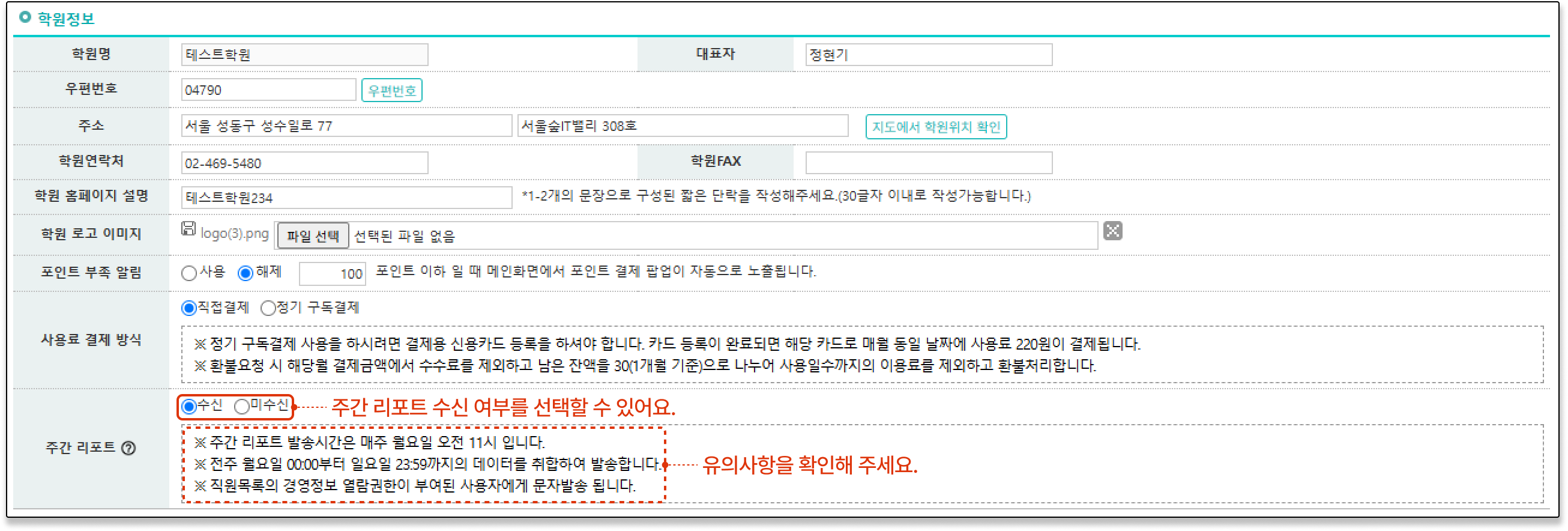 학원의 주간 리포트 영역에서 수신 선택 후 [저장] 버튼을 눌러주세요.