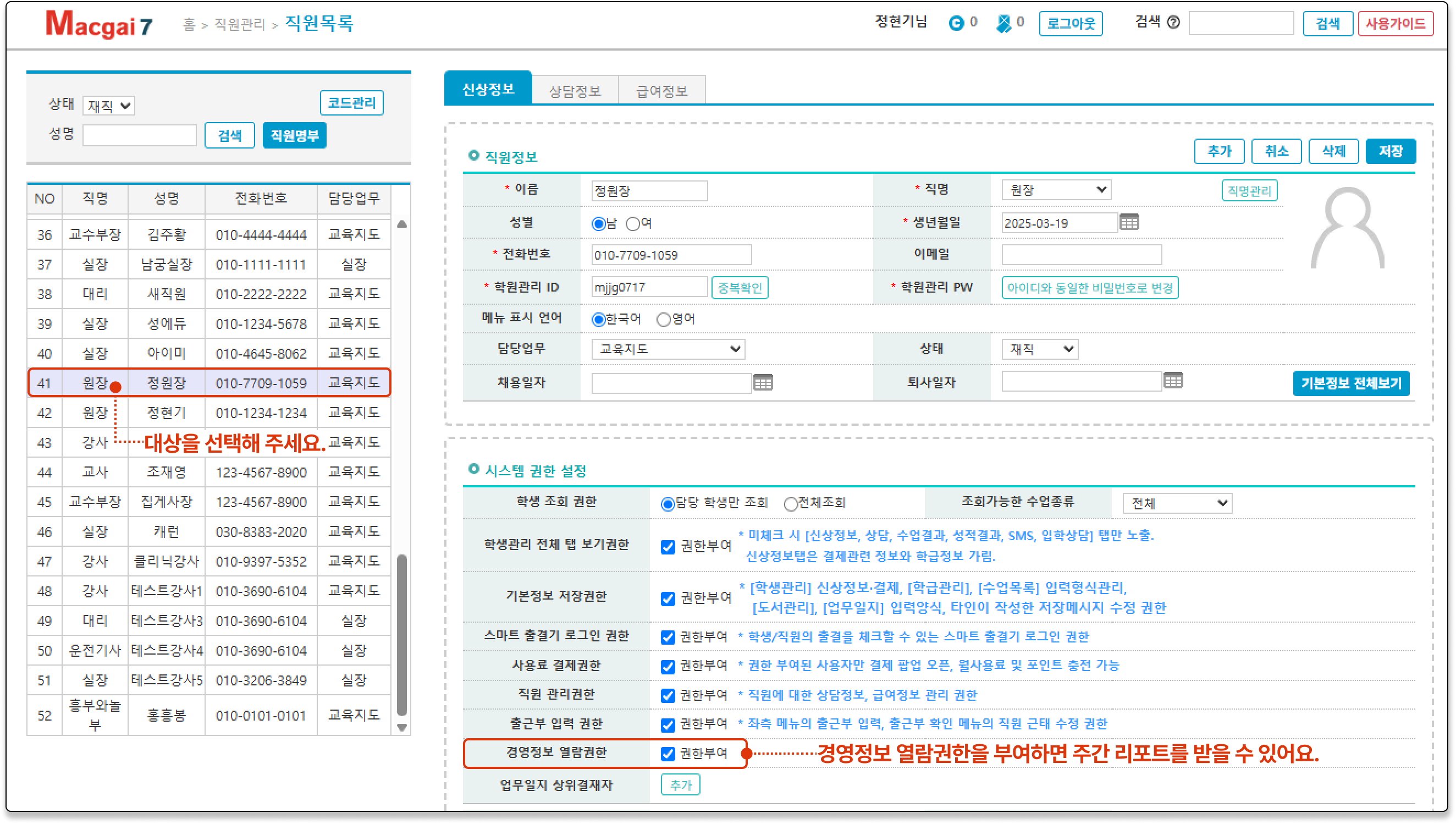 이용메뉴: 관리메뉴 → 학원정보 → 학원정보관리