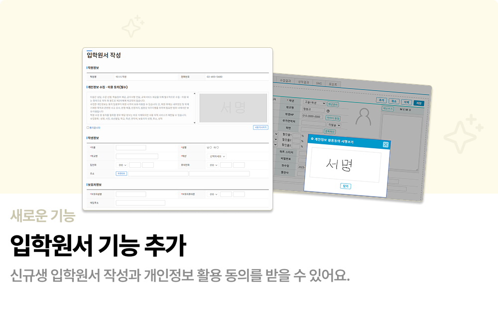 입학원서 및 개인정보 활용 동의를 받을 수 있는 기능이 추가됐습니다.출결 알림톡 추가