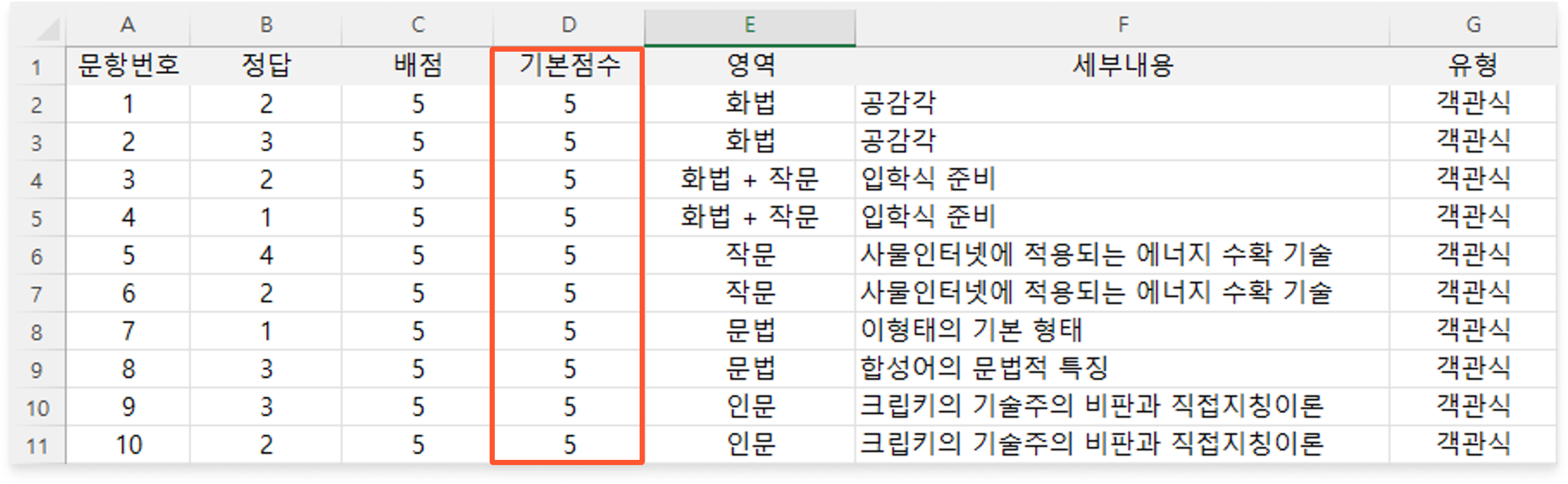 기본 점수 기능이 사용 가 능한 상태로 되어있으면, 시험 입력 메뉴의 문항정보 샘플 엑셀 파일에 기본 점수 열이 추가됩니다.
