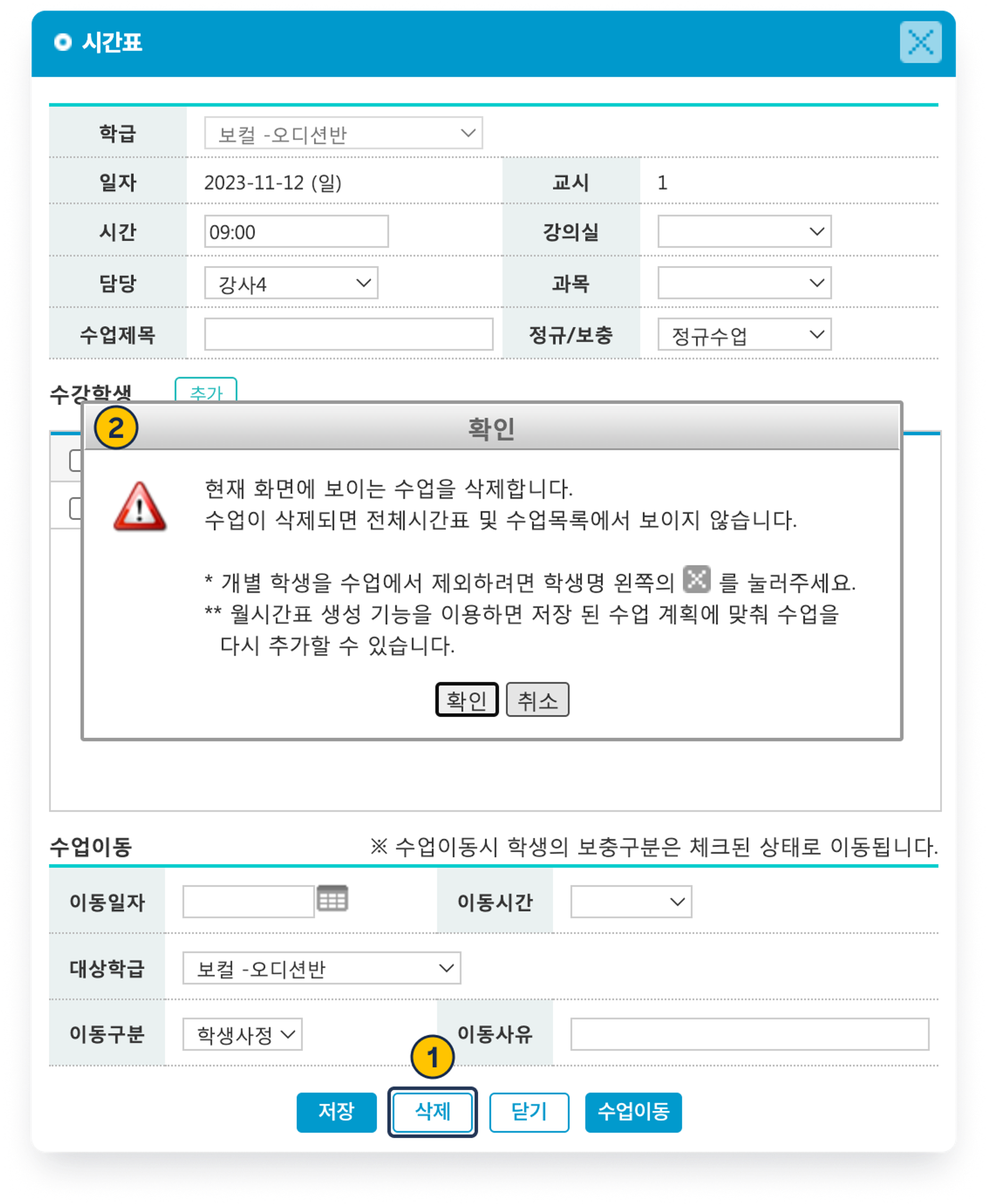 개별 수업을 열어 삭제 진행 시 노출되는 메시지를 명확하게 변경했어요.