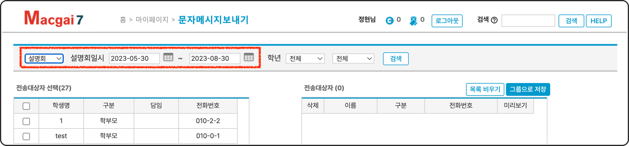 설명회 신청자를 날짜별로 검색하여 문자를 보낼 수 있게 되었어요. 어떤 설명회에 신청했는지 여부와 관계 없이 신청한 설명회의 날짜를 기준으로 검색합니다.