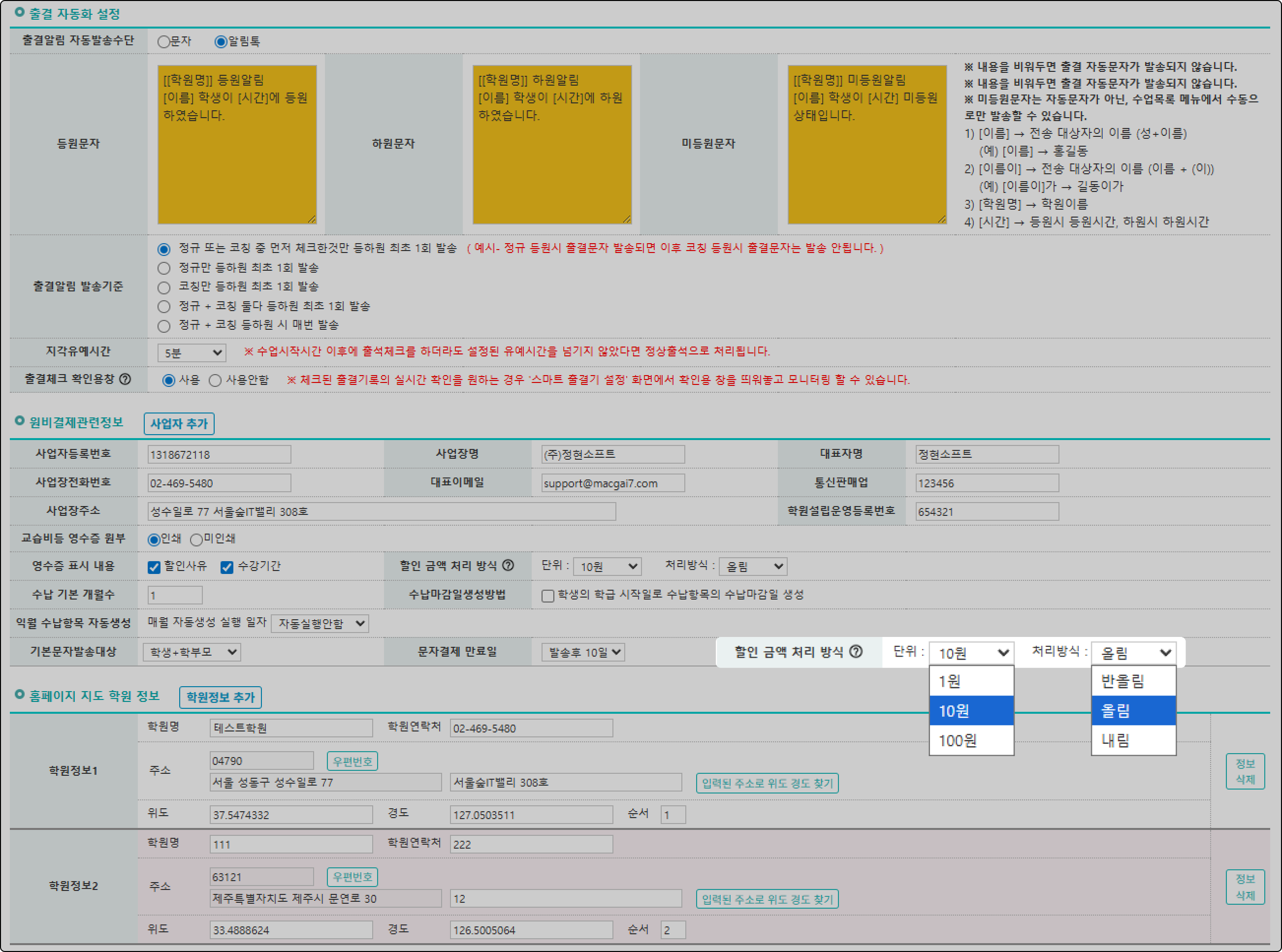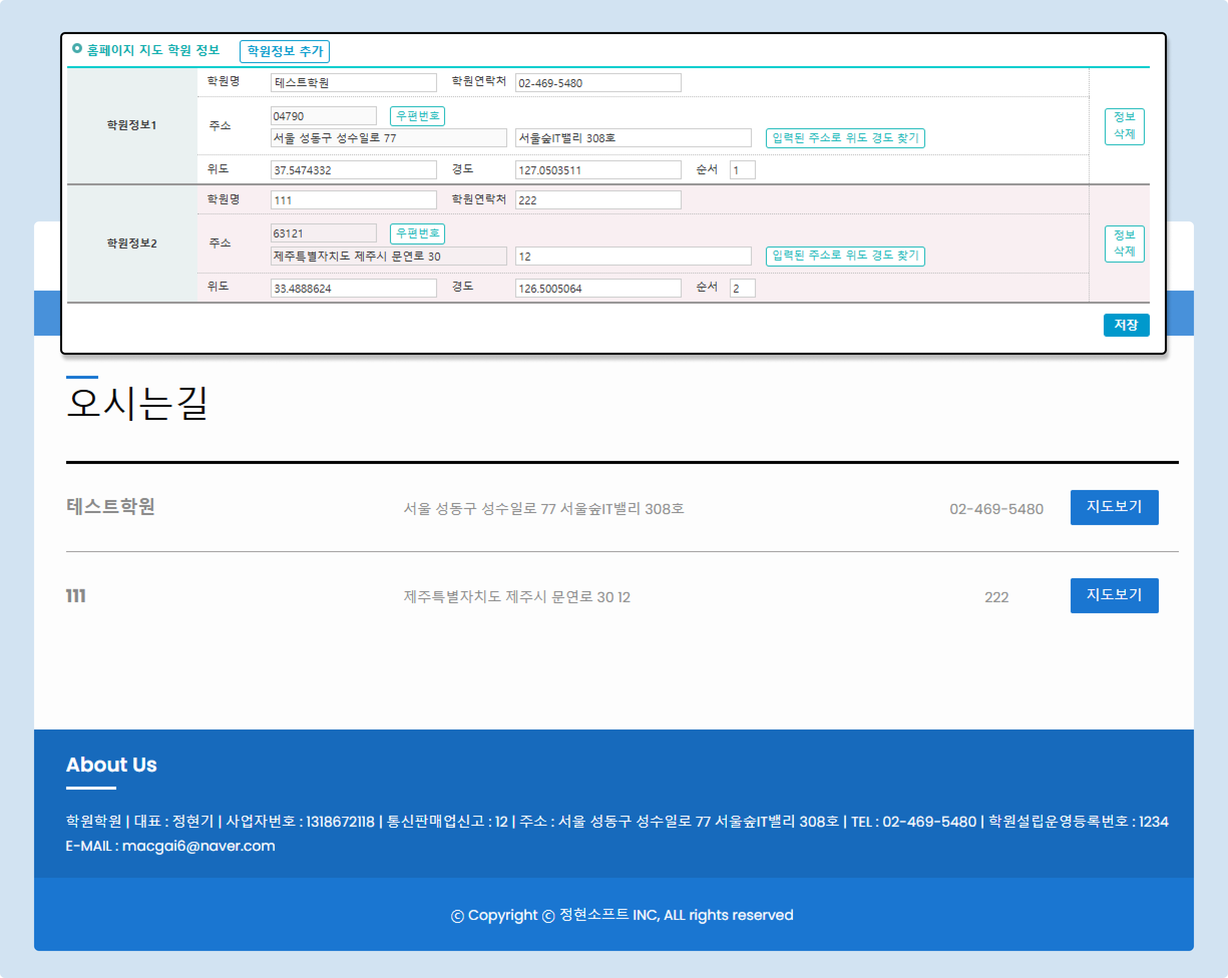 [관리메뉴→학원정보관리]에서 홈페이지 지도 학원 정보 영역이 추가됐어요.(최대 10개)