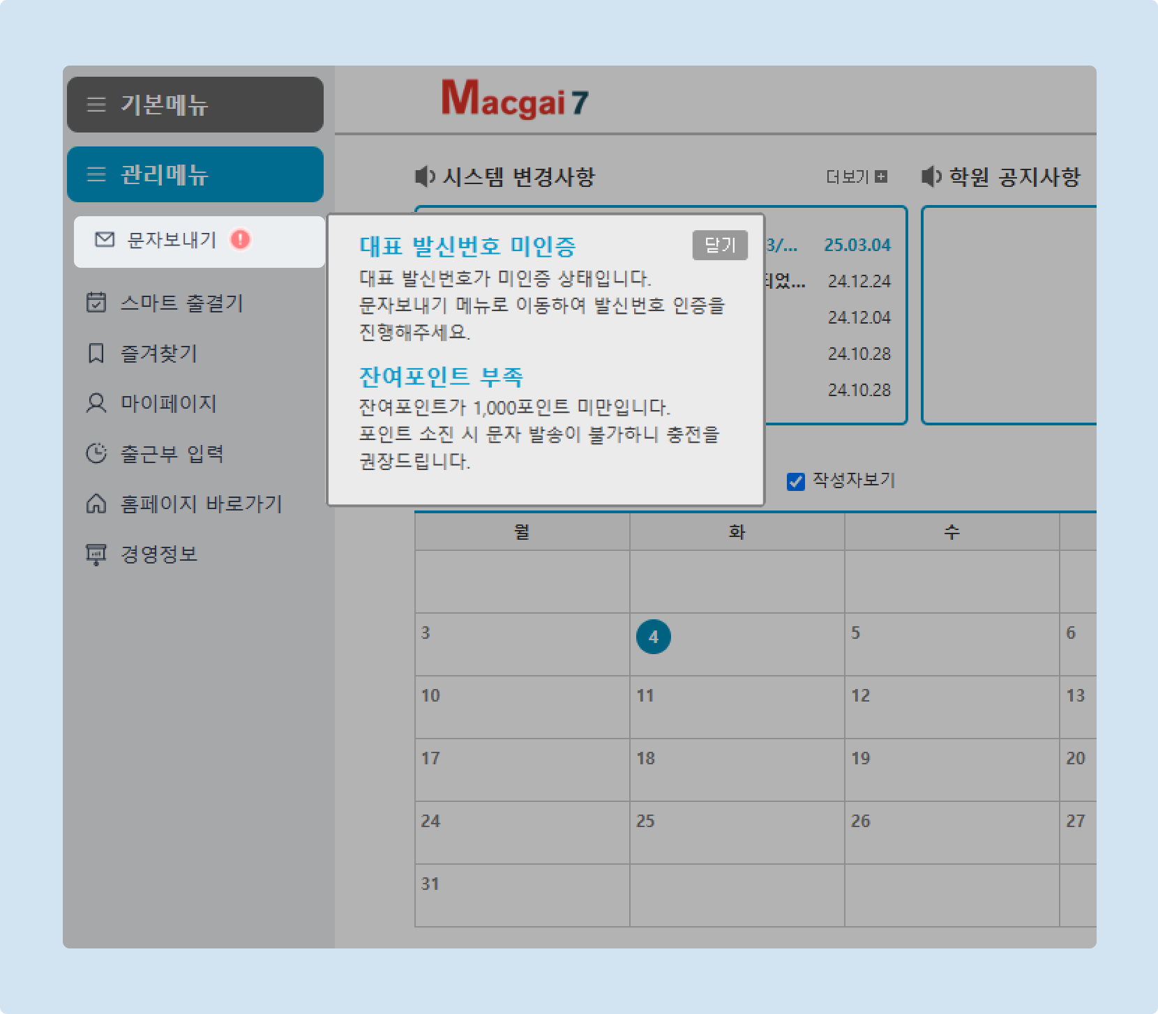 좌측 네비게이션 문자보내기 메뉴에 !경고 아이콘이 노출되면 마우스를 올려 원인을 상세히 알 수 있어요.