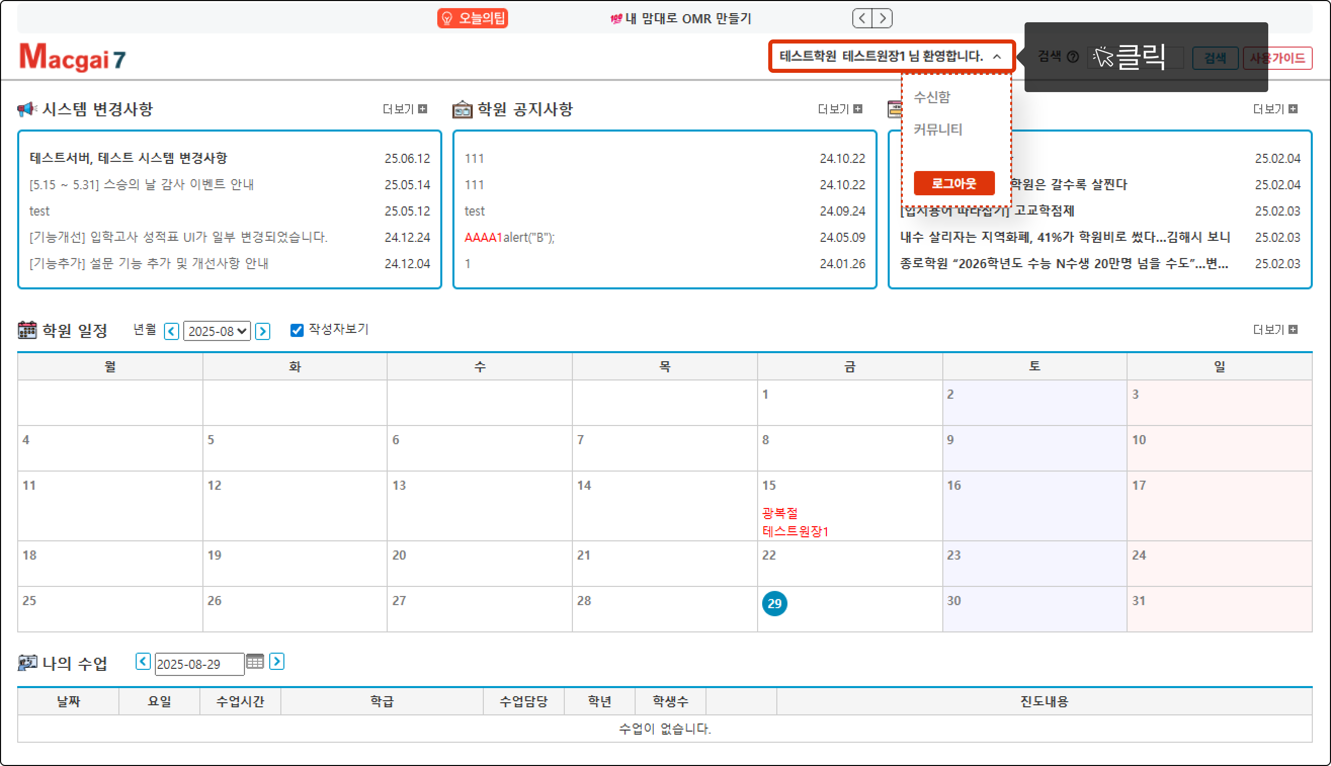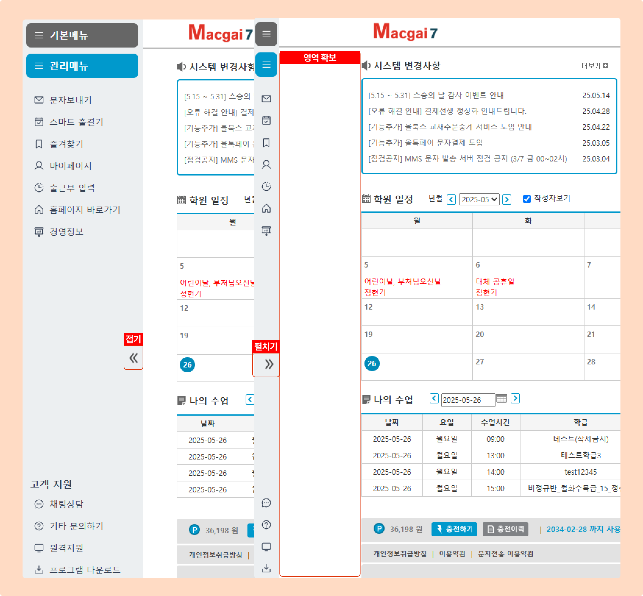 기능의 추가와 더 많은 필수 항목을 담기 위해 가로 폭 사이즈를 확대했어요. 단일 모니터를 사용하여 사이즈가 확대되어 불편한 학원의 경우 사이드바를 접고 펼칠 수 있는 기능을 사용할 수 있어요.