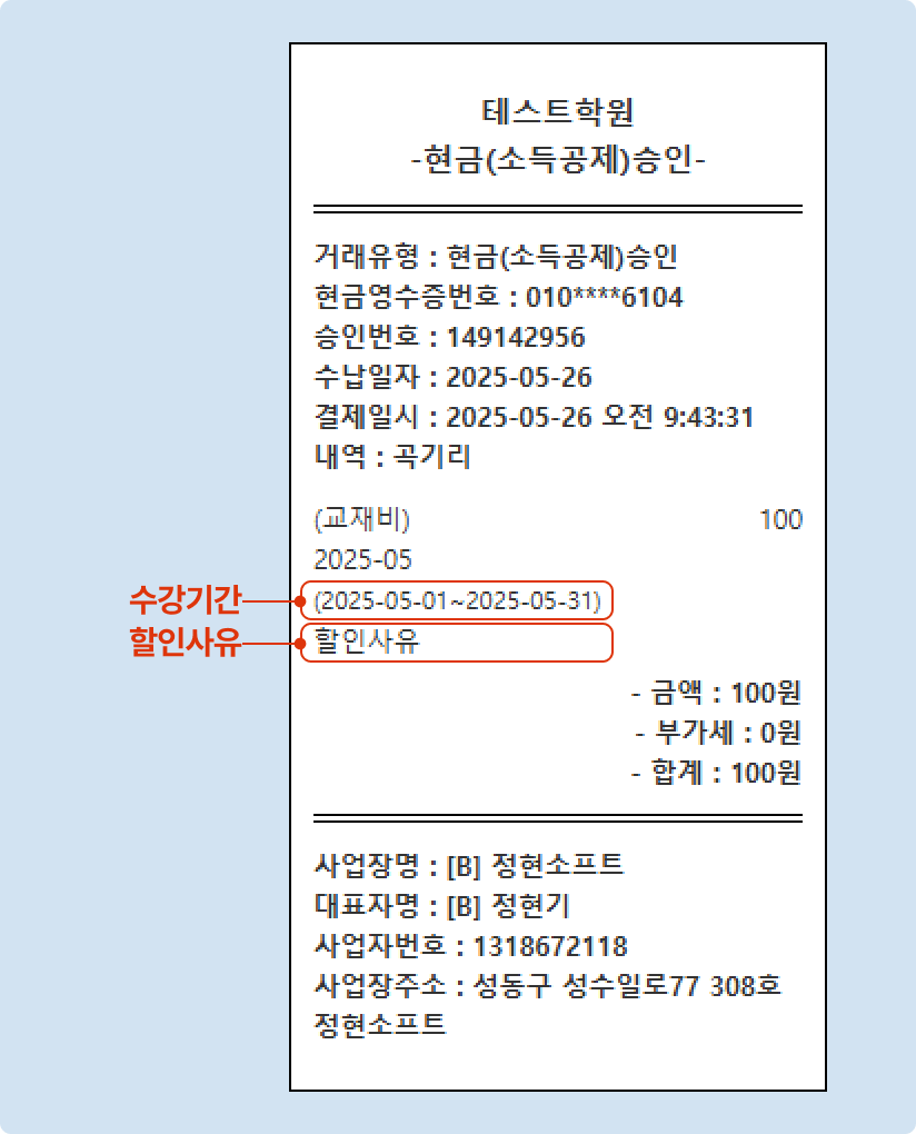 영수증에 수강기간과 할인사유를 표시할 수 있어요. 선택적으로 항목을 설정하고 원하는 시기에 표시 항목을 활성화할 수 있어요. 자세히 보기↗