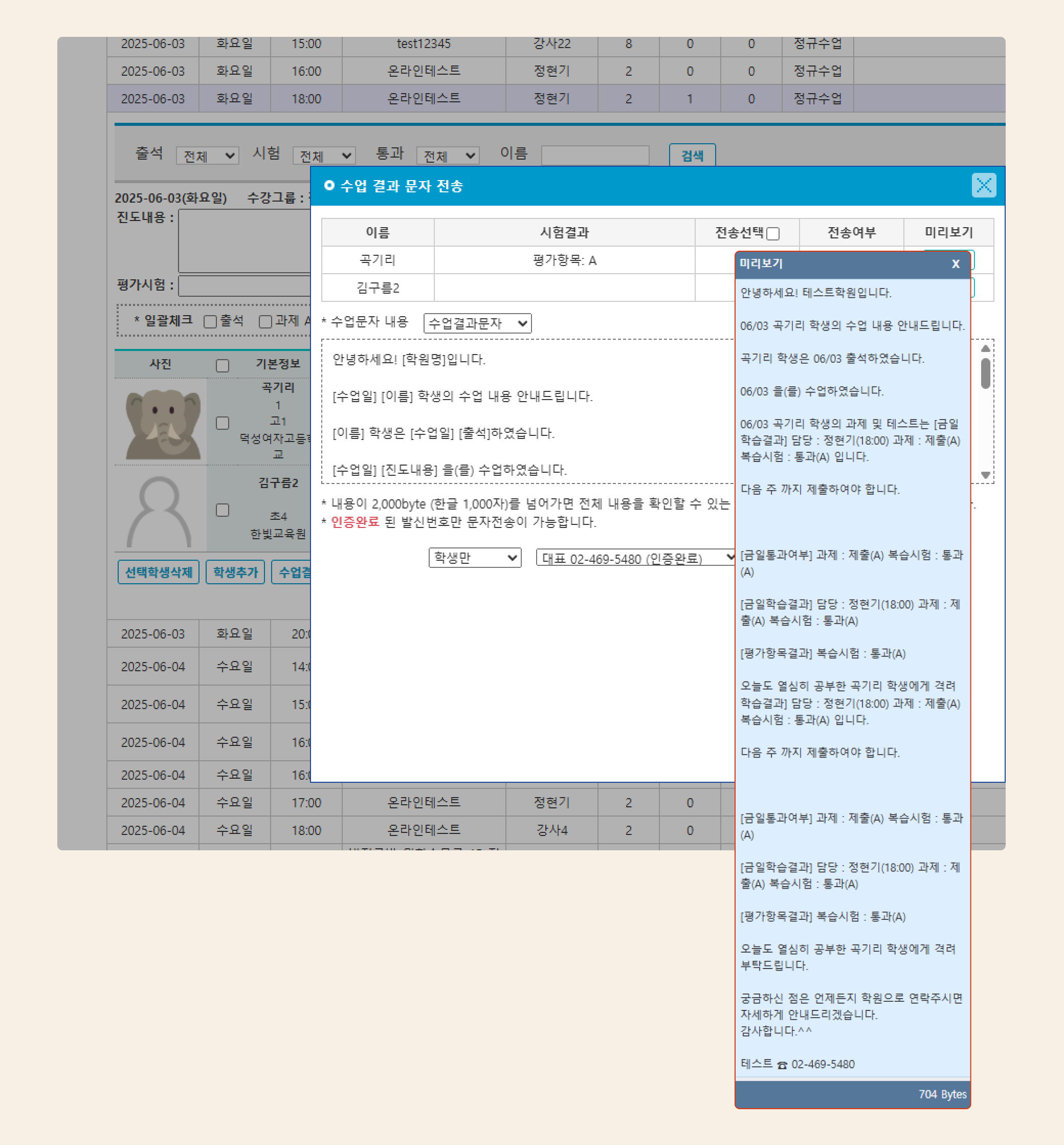 수업 결과 문자 전송 시 같은 날 여러 수업이 있을 경우 '일 기준'으로 일괄 적용되던 수업 문자 전송 여부 문제를 '수업별' 문자 전송 여부의 확인이 가능하도록 수정했어요.