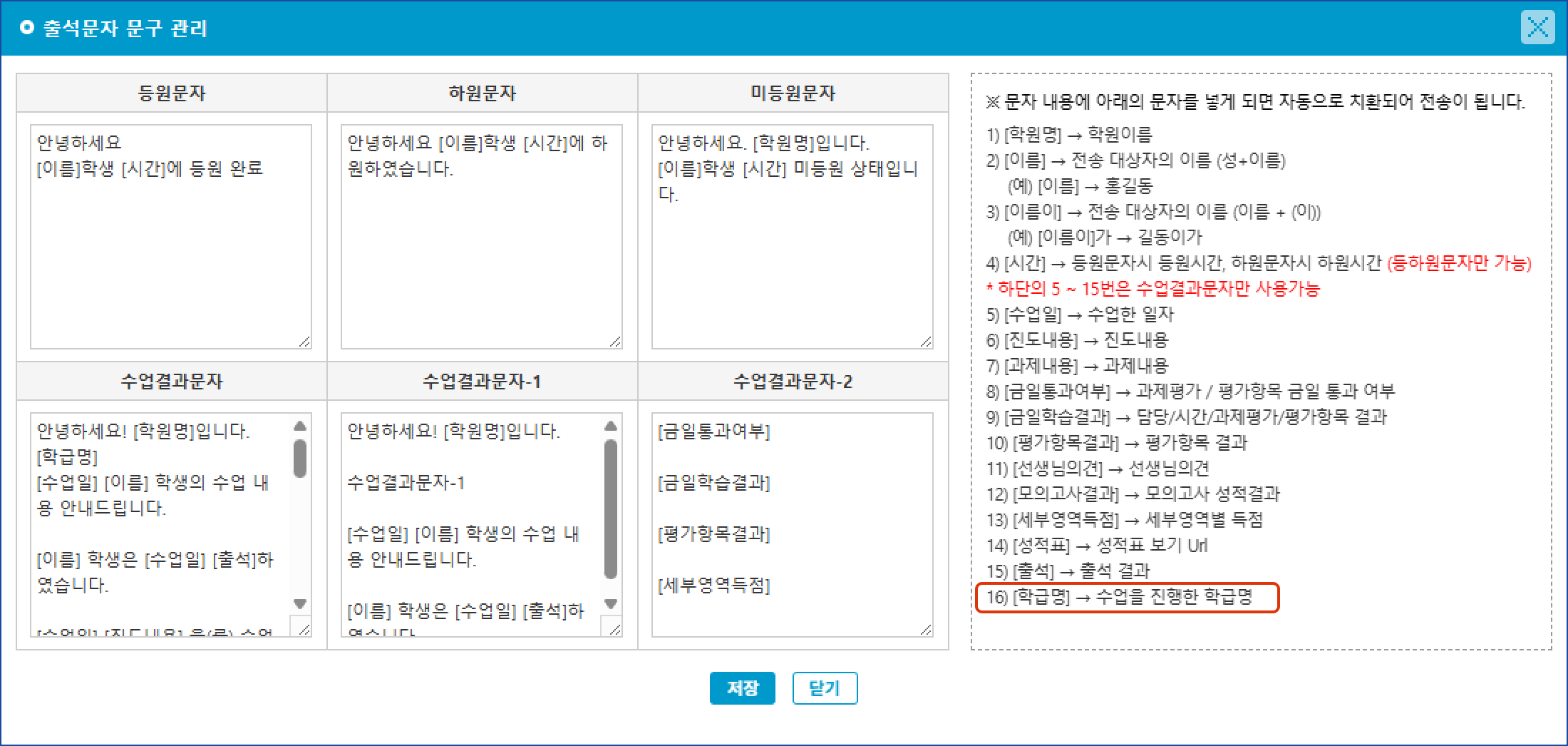 [수업 결과 문자 - 치환 값 학급명 추가]