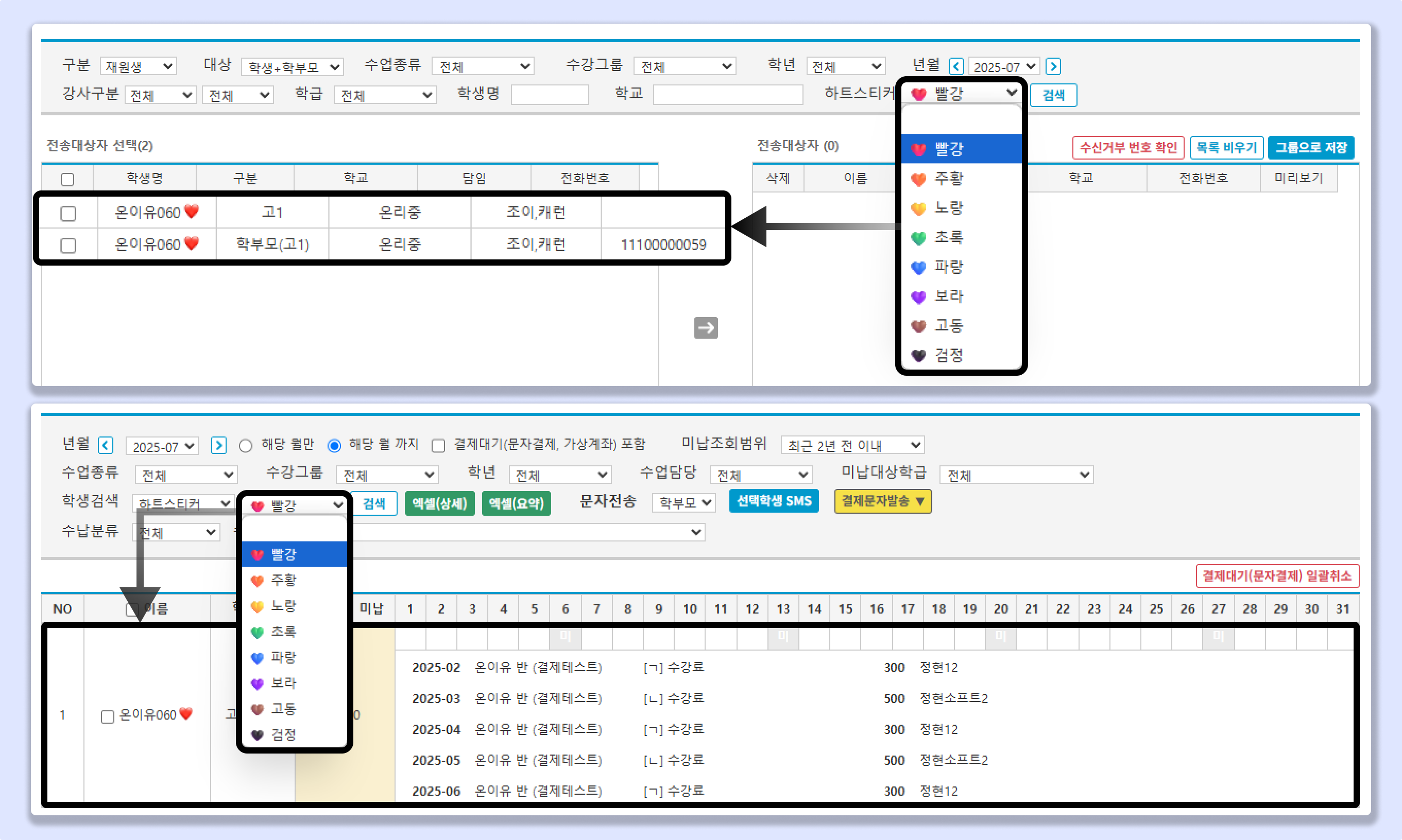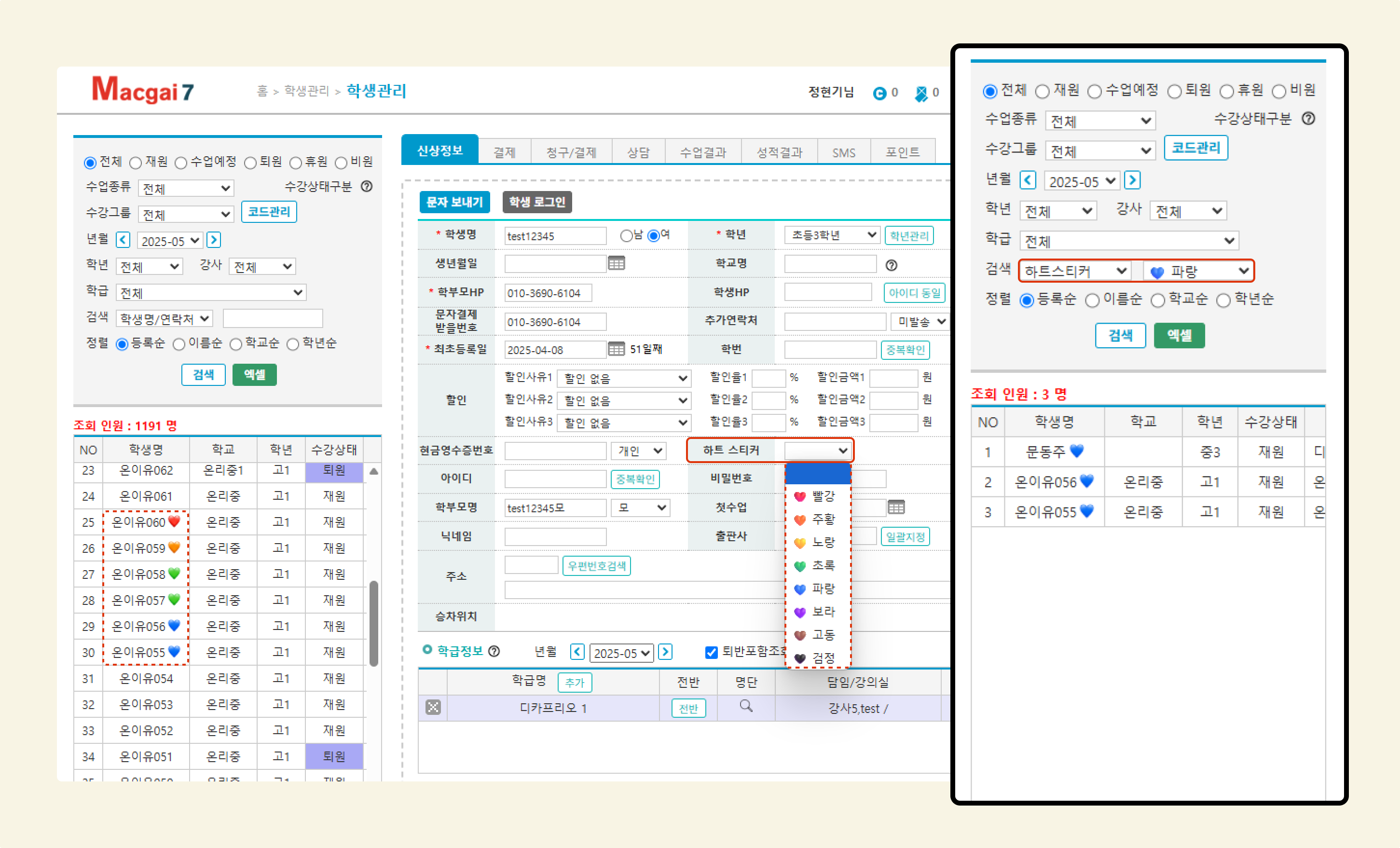 효율적인 학생 관리를 위해 학생에게 스티커를 붙일 수 있는 기능이 추가되었어요. 색깔별 하트 스티커를 추가하여 특이 사항을 한눈에 파악할 수 있고, 하트 스티커 색깔별 검색도 가능해요.