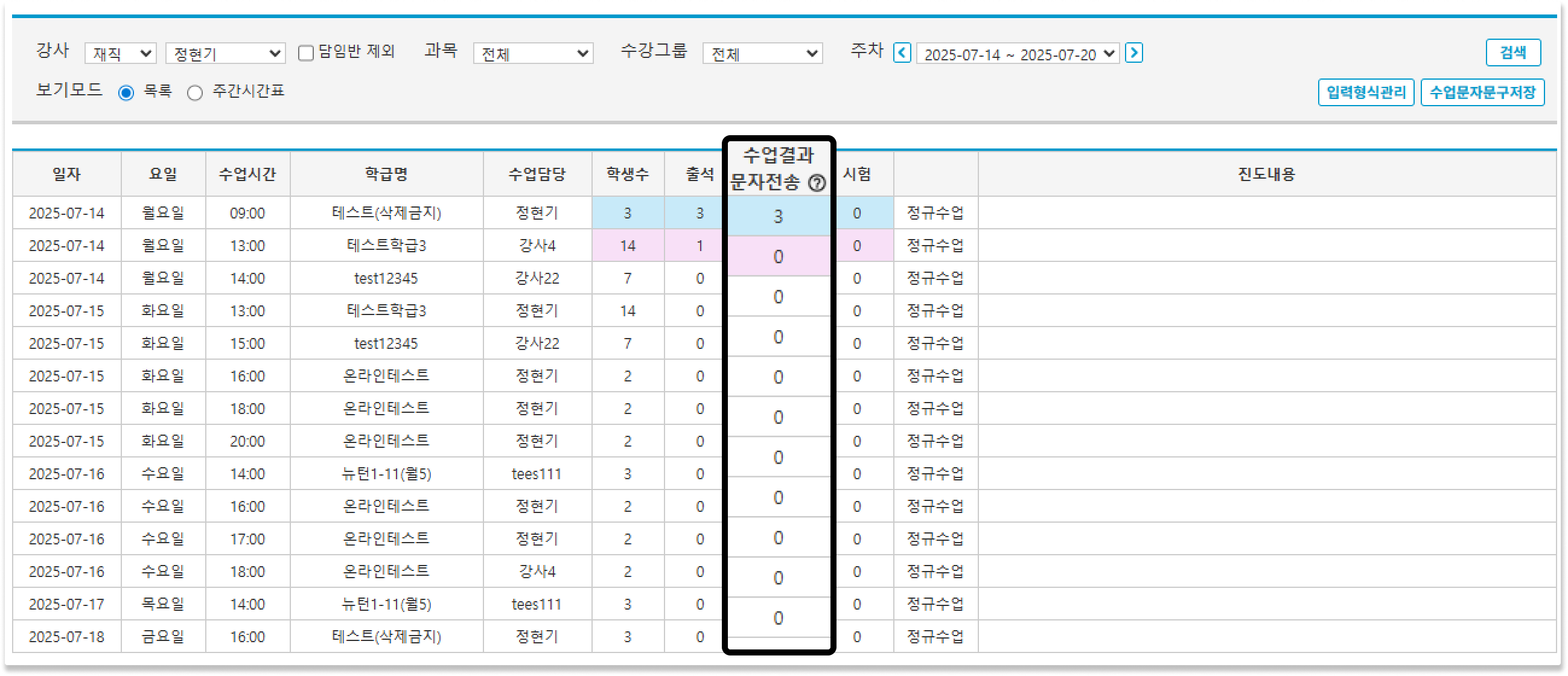 수업결과 문자를 발송한 수치를 확인할 수 있는 영역이 추가되었어요.