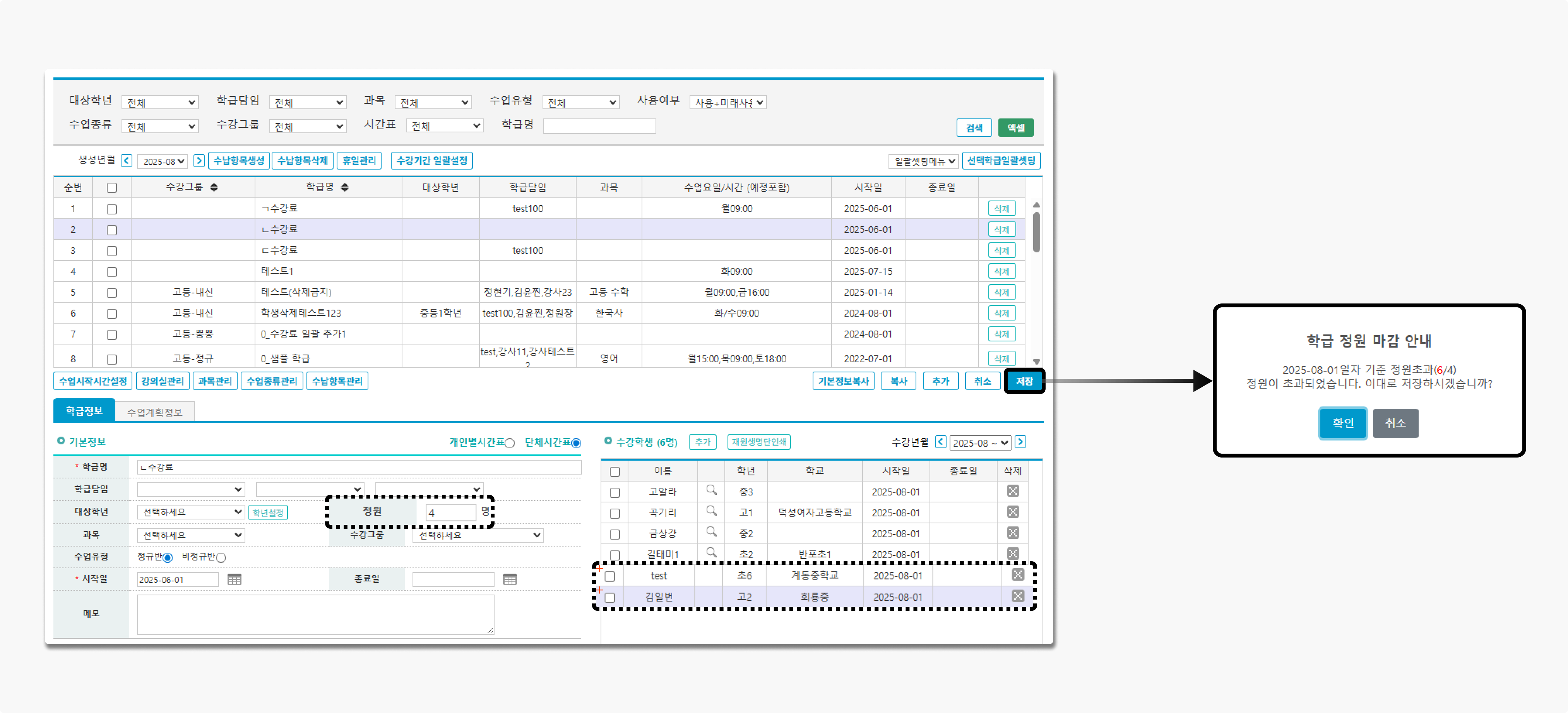 학급에 수강학생을 추가할 때 정원 제한이 초과되면 정원 마감을 안내하는 컨펌 창이 추가되었어요.