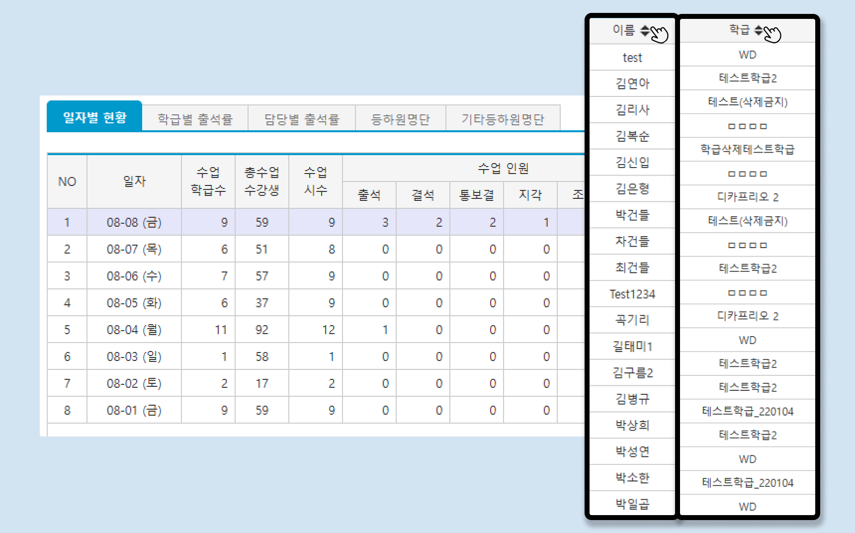 이름 또는 학급으로 정렬할 수 있는 기능이 추가되었어요.