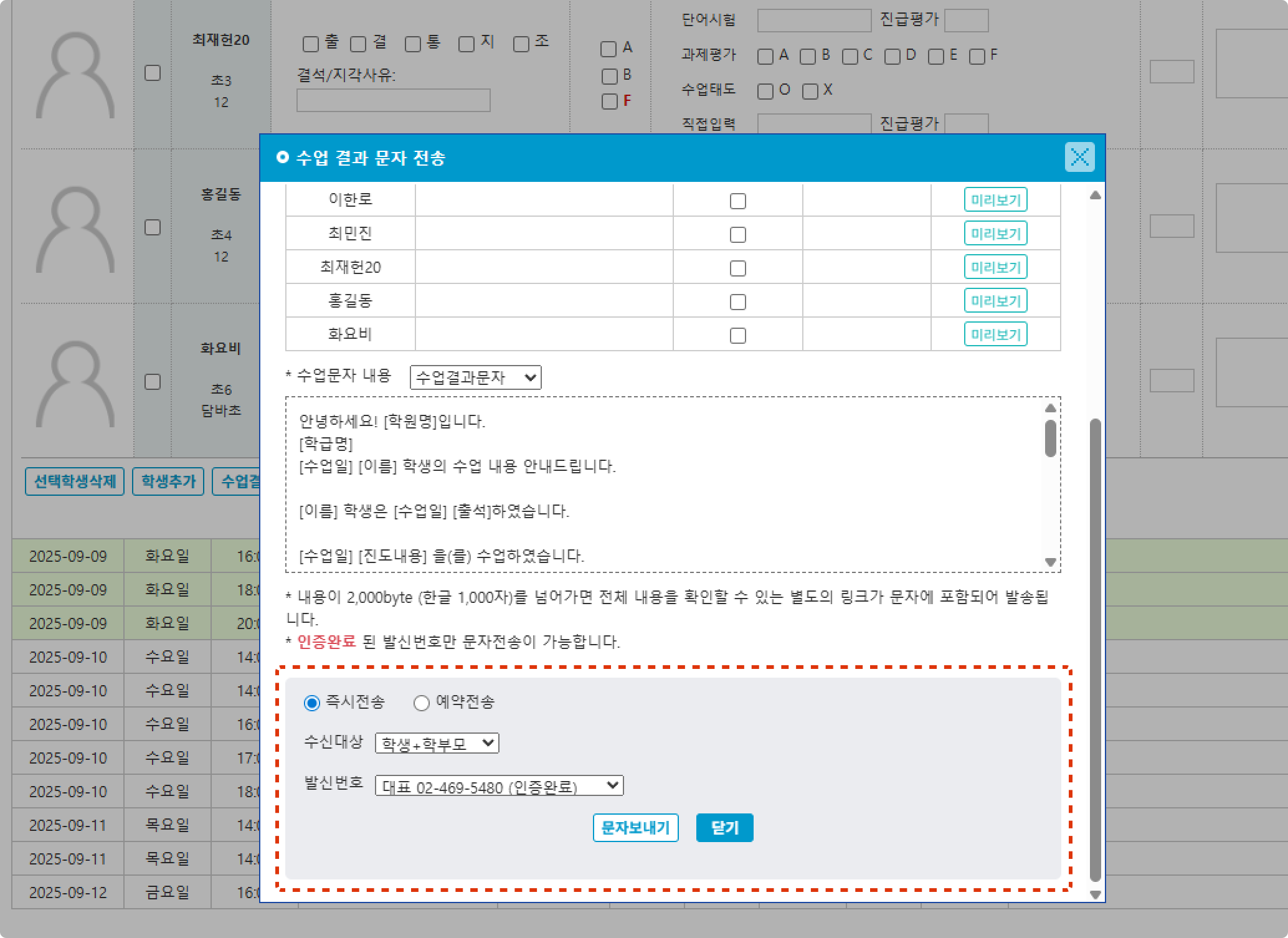 수업 결과 문자를 보낼 때 예약 문자로 전송할 수 있는 기능이 추가되었어요.